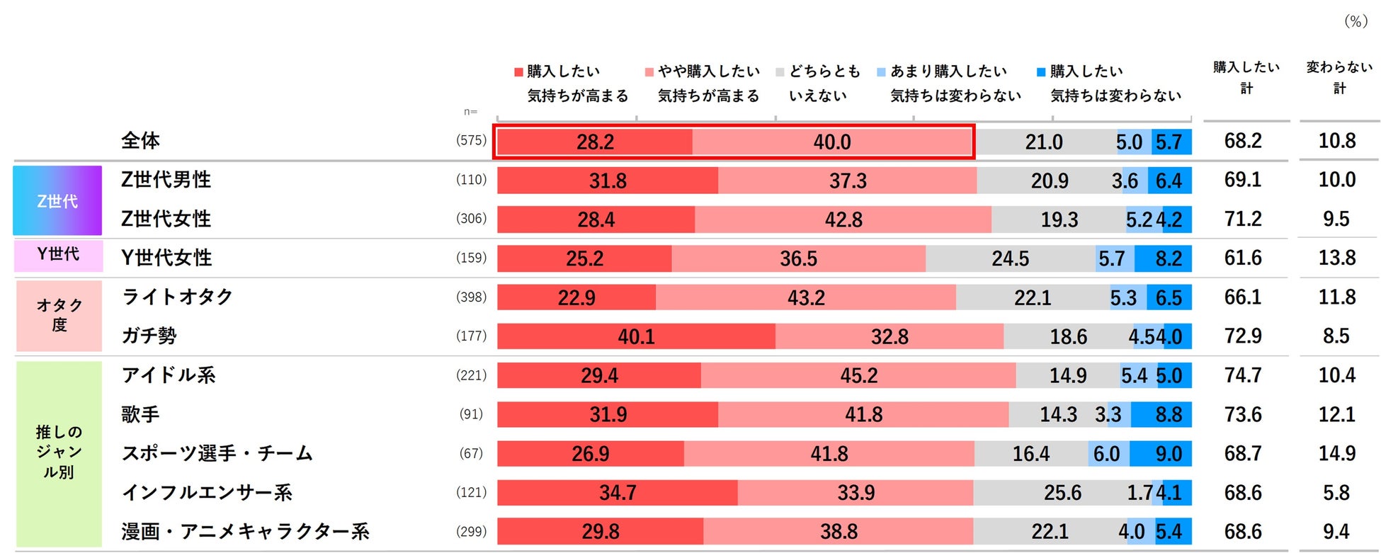 推しを起用した企業の商品・サービスは購入意欲が高まるのかを確認したところ、全体的に購入意欲は高まる傾向となり、推しの存在が購買行動に影響を与えることがわかりました。また、推し活の内容として、グッズ購入も多く挙がっていたことからも、推しに関連したものを購入することは身近にできる推し活でもあり、身近に推しの活躍を感じられることをうれしく思う人も多いのではないでしょうか。