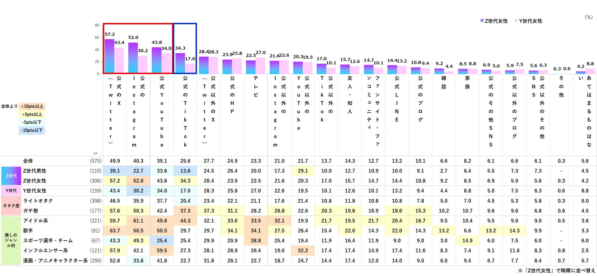 全体として公式のSNSが上位に挙がり、その中でも公式Xがほとんどの世代・性別・ジャンルで1位を占める結果に。公式以外のXも1~3位に多く挙がっており、情報収集に使いやすいツールの1つとなっていることがわかる。Z世代では推しとの出会いとしてもSNSが上位に挙がり、普段からSNSを活用して情報収集していることが窺える。