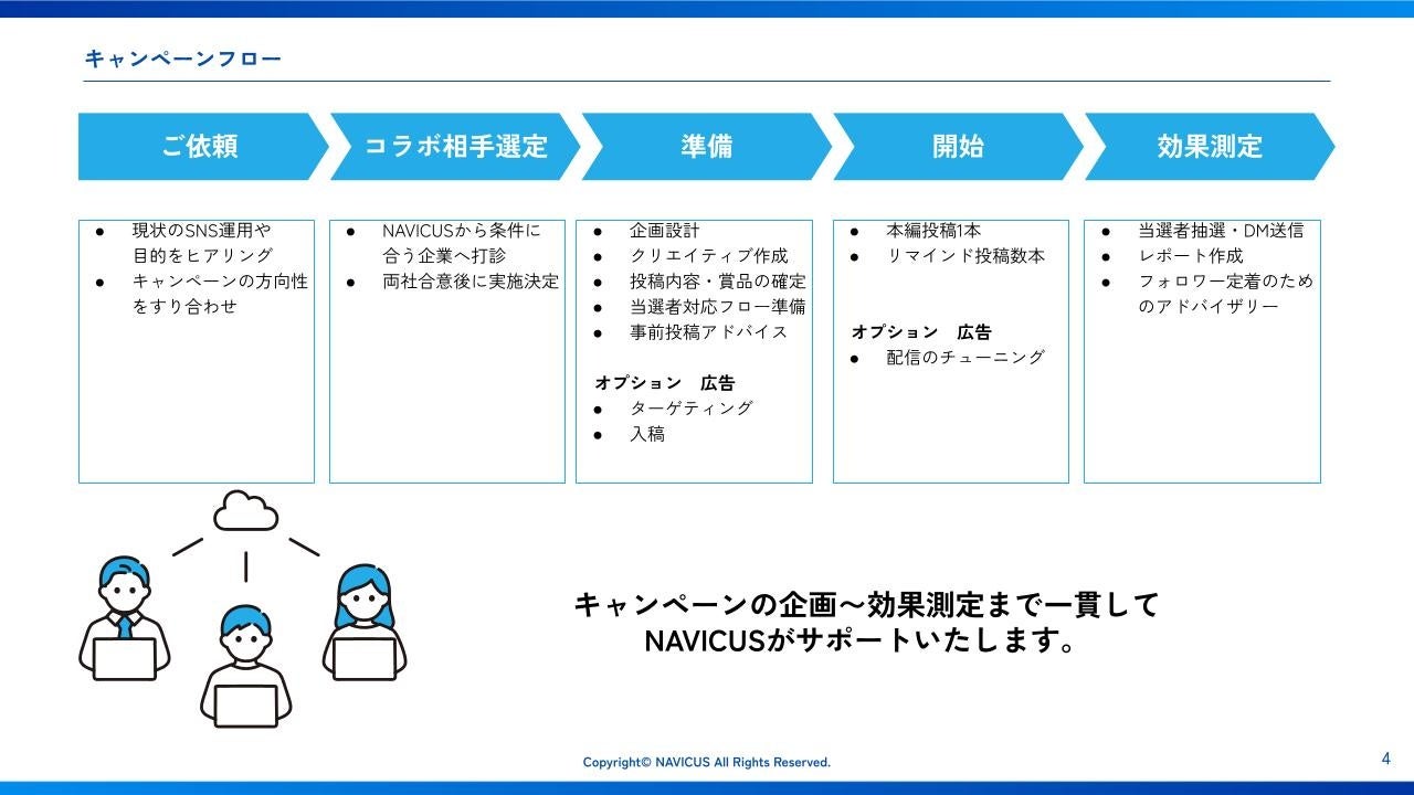 企業によるSNSキャンペーンは広く活用されていますが、実施後の効果が持続せず、一過性の取り組みに留まるケースが多く見受けられます。NAVICUSは、ご支援先の累計フォロワー数が1億620万人にも上るSNS運用支援の知見をもとに、キャンペーンの効果を持続可能なものとするため、「SNSコラボキャンペーン」を開発いたしました。