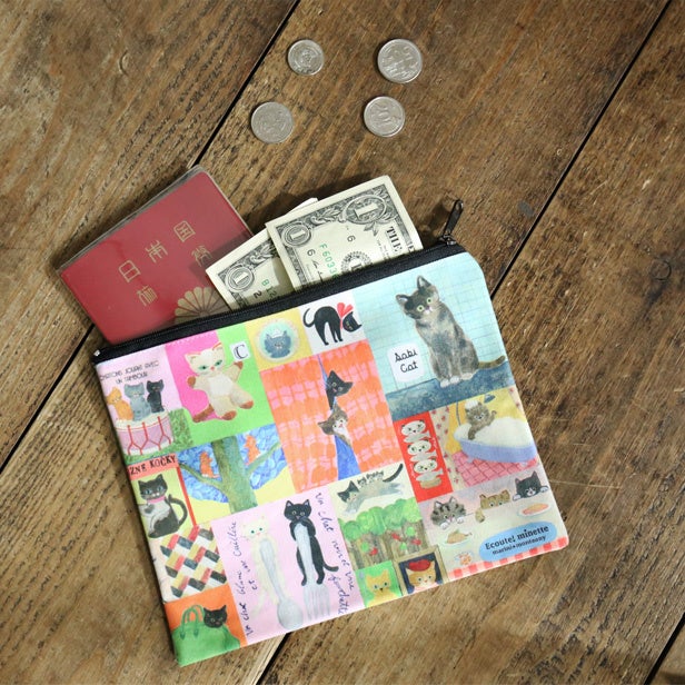 普段の持ち歩きから旅行の時にも便利に使える大きめサイズのポーチは、人気2人組クリエイターユニットmarini*monteany(マリーニ*モンティーニ)の猫のイラストがたまらないかわいさです。