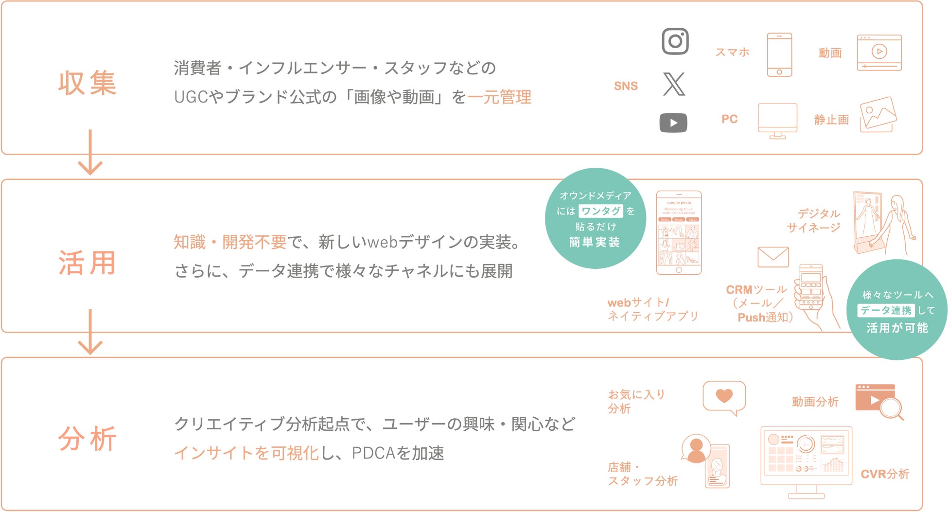 消費者・インフルエンサー・スタッフなどのUGCやブランド公式の「画像や動画」を一元管理