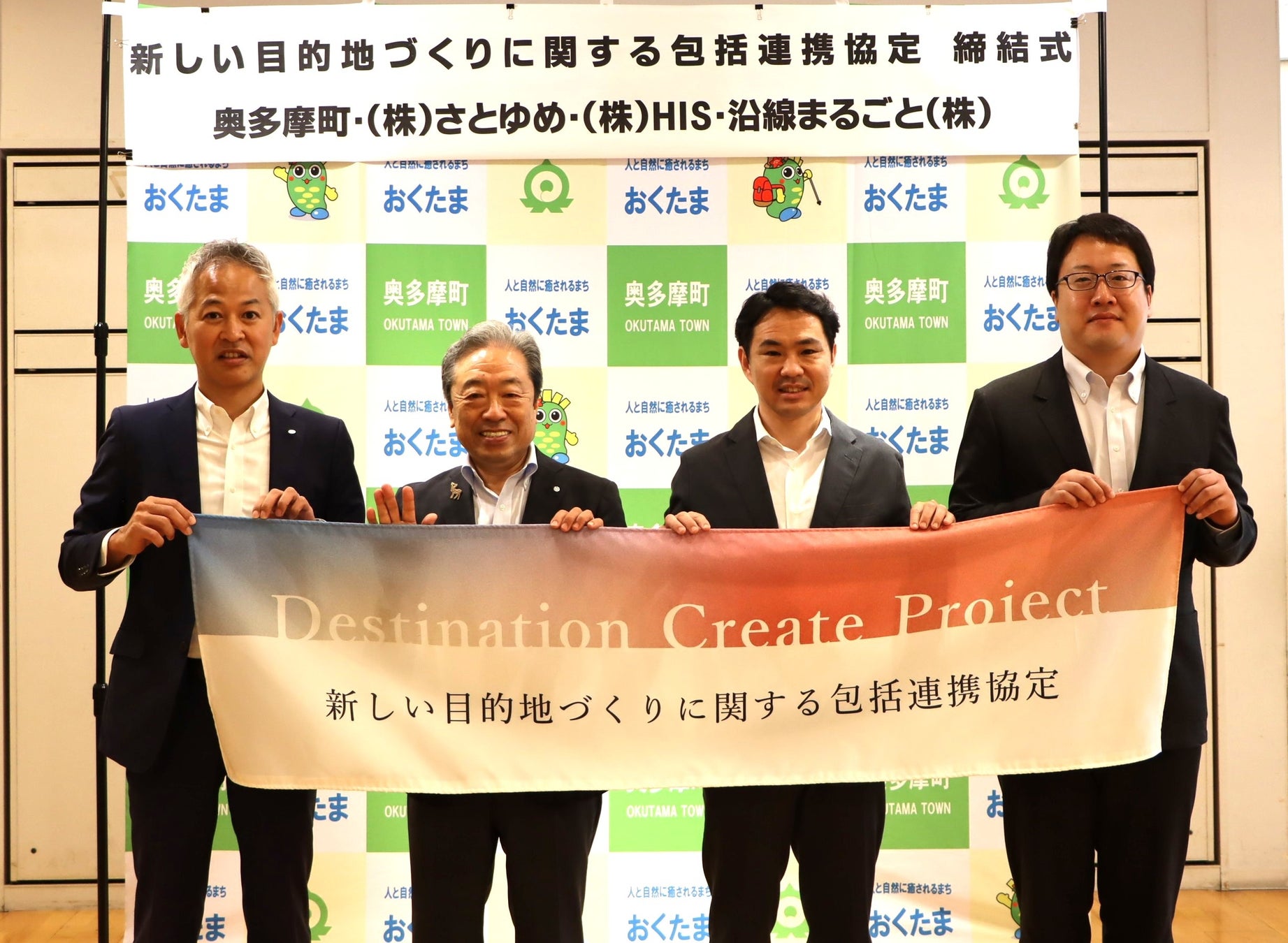 全国50エリア以上で地方創生事業のプロデュースを行う株式会社さとゆめ(本社:東京都千代田区、代表取締役CEO:嶋田 俊平、以下「さとゆめ」)と、奥多摩町(町長:師岡 伸公)、沿線まるごと株式会社(本社:東京都西多摩郡奥多摩町、代表取締役:嶋田 俊平、以下「沿線まるごと」)及び、株式会社エイチ・アイ・エス(本社:東京都港区、代表取締役社長:矢田 素史、以下「HIS」)は、「新・目的地創出事業-Destination Create Project-」(以下「DCP」)(※1)に関する包括連携協定を締結しました。