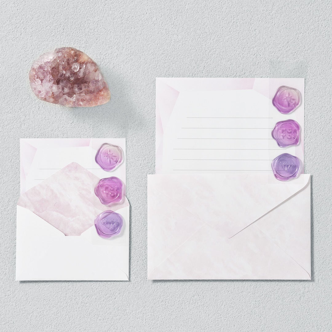 今回新発売するレター『MINERA(ミネラ)』は、鉱物をモチーフにしたデザインです。ラインアップは、「ブルーレースアゲート」「ピンクアメジスト」「ジェイド」「マーブル」の4種類で、鉱物の質感を思わせる色味や模様により、デザインごとに異なる表情を楽しめます。サイズは郵送に便利な定形郵便サイズと、ギフトに添える際などに最適なミニサイズの2種類です。付属するシールは、クリアタイプのシーリングワックスのような見た目と質感です。封緘や装飾のアクセントとして使用でき、立体的で上品なワンポイントが、レターに特別感をプラスします。