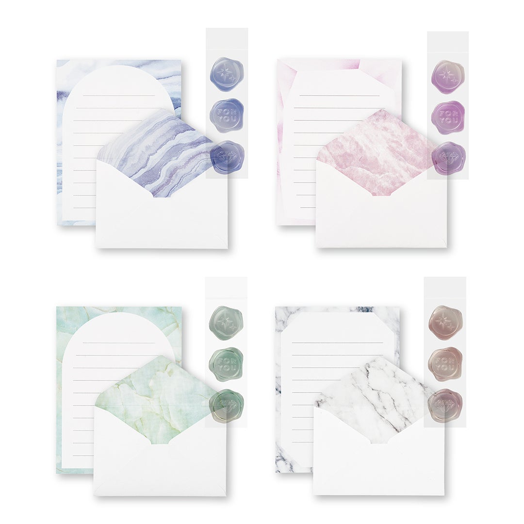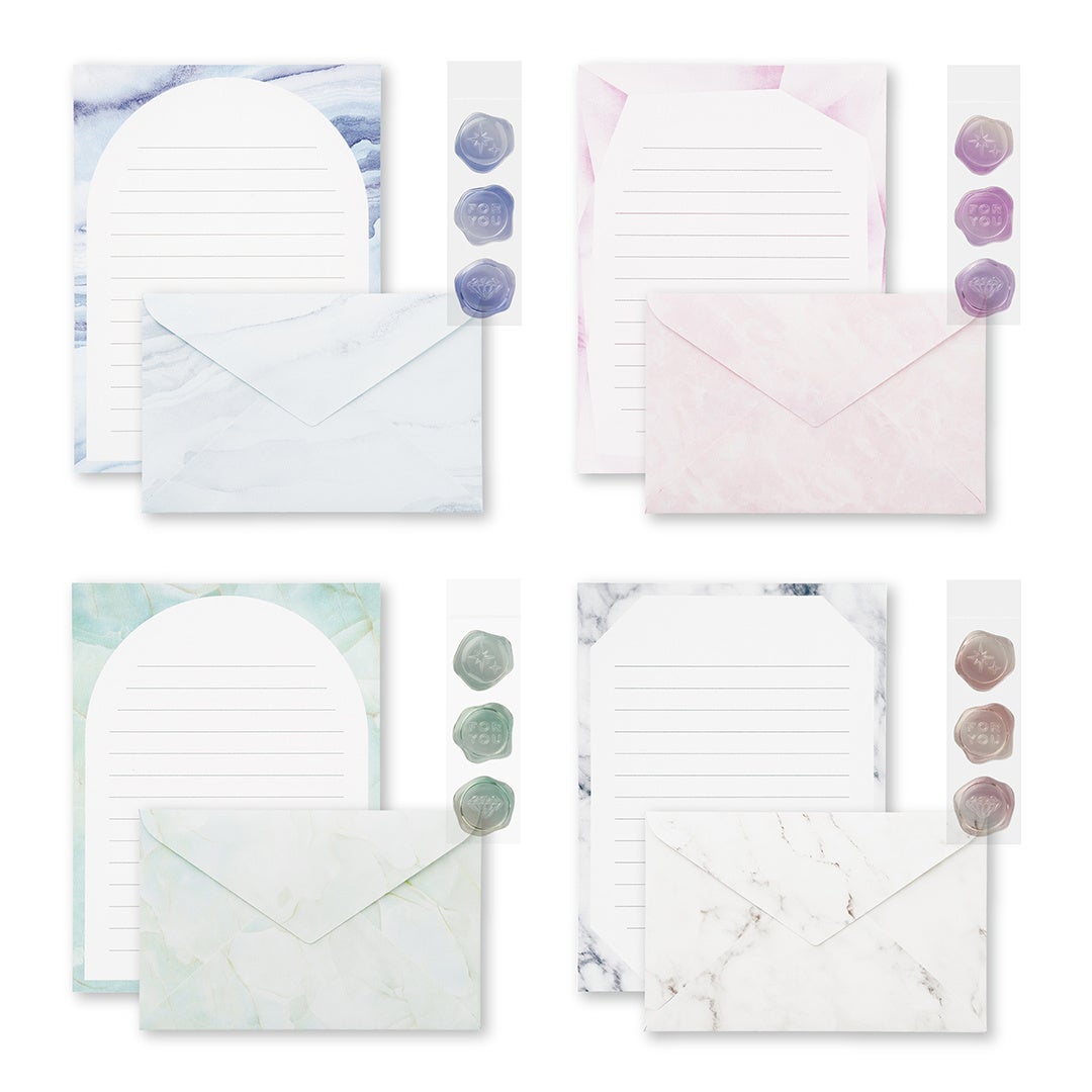 価格:473円(税込)/種類:4種(ブルーレースアゲート、ピンクアメジスト、ジェイド、マーブル)/製品寸法:[封筒]W96×H65mm、[便箋]W90×H120mm/内容:封筒3枚、便箋6枚、シール3枚/製品紹介ページ:https://paper.maruai.co.jp/shop/c/c07019970/