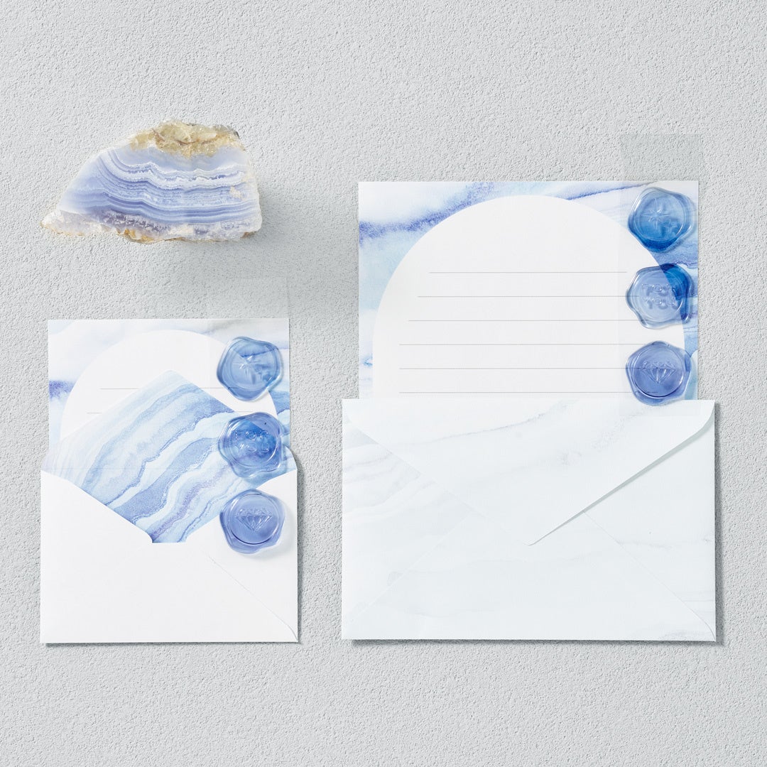 価格:583円(税込)/種類:4種(ブルーレースアゲート、ピンクアメジスト、ジェイド、マーブル)/製品寸法:[封筒]W140×H90mm、[便箋]W127×H168mm/内容:封筒3枚、便箋6枚、シール3枚/製品紹介ページ:https://paper.maruai.co.jp/shop/c/c07019971/