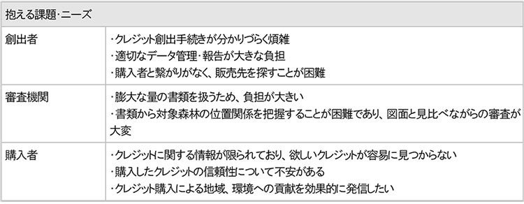 ・創出者向け:GISを活用した各種データの地図上での一括管理、クレジットの算定に必要なデータの自動入力や作成ガイドなど申請書類作成支援機能を提供。