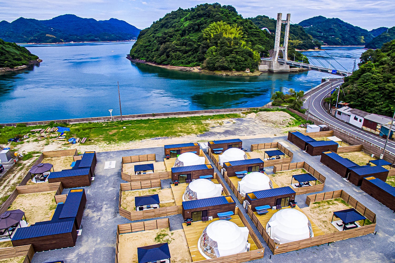 島市内より車でわずか1時間半の好立地にあるグランピング施設、とびしま海道の島の一つ大崎下島のオーシャンビューの好立地に4タイプ全8棟のオーシャンビューヴィラが新登場。