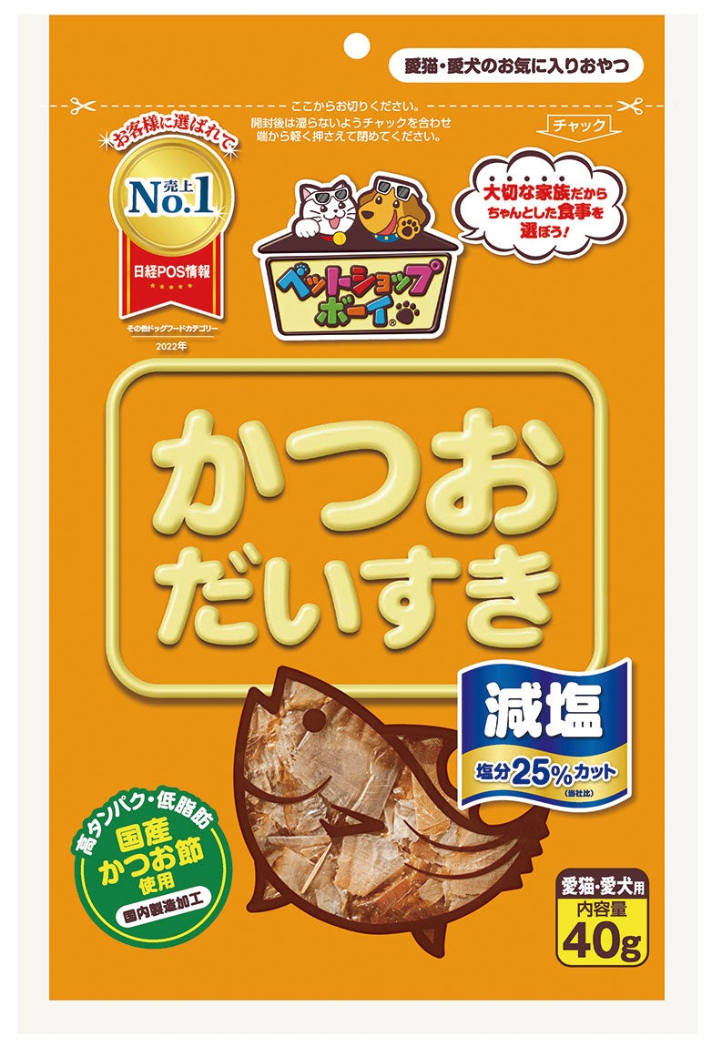 「減塩かつおだいすき40g」は、ペット用おやつとして販売しているマルトモ「だいすきシリーズ」の一つで、大切な家族の一員であるねこちゃん・わんちゃんに安心・安全な食事を提供したいという想いで作られた商品です。近年、ねこちゃん・わんちゃん達も平均寿命が延び健康寿命が課題といわれている中、マルトモはねこちゃん・わんちゃん達の食生活改善のためにいち早く減塩商品提案に取り組んでおり、この商品は、当社一般品に比べ塩分を約25%カットした、健康に配慮した商品となっております。なお、2022年は「その他削り節カテゴリー」にてマルトモ「だしの力100g」も4年連続売上No.1 を獲得しました。