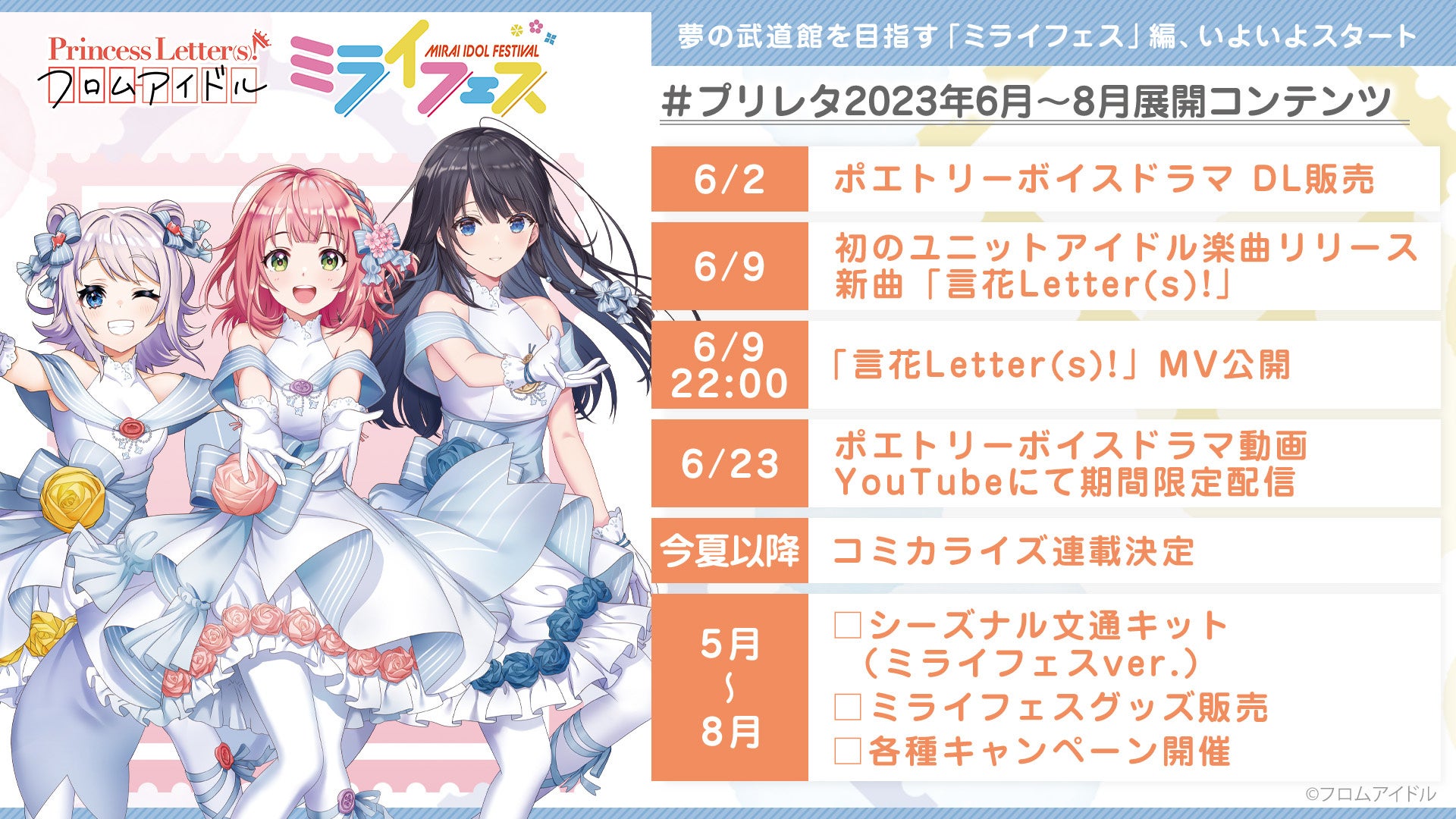 発売中のシーズナル文通キットやボイスコンテンツの他、3人のアイドルが初めてユニットを組む新規アイドル楽曲「言花Letter(s)!」(6/9(金)リリース予定)、コミカライズ(今夏予定)、各種キャンペーンを続々展開いたします。