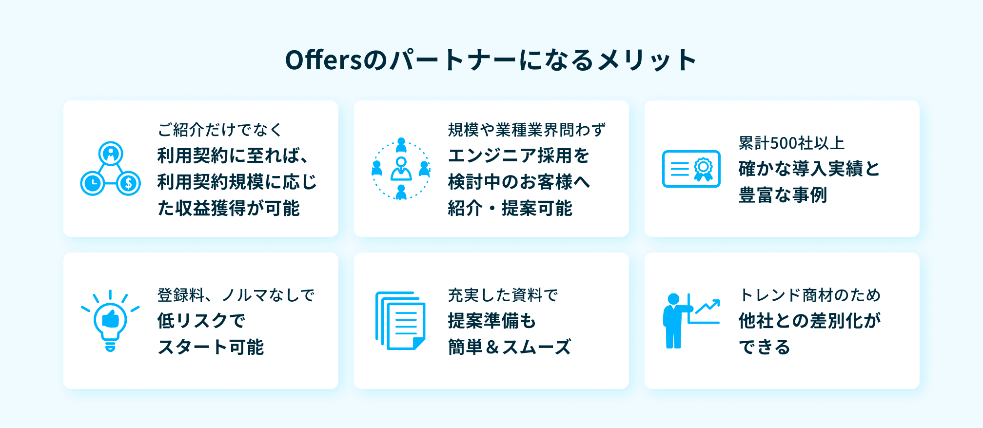 パートナー様からお客様へ、Offersをご紹介いただき、興味をお持ちいただいたお客様をOffers運営のoverflowへご紹介いただきます。本プログラムを通じて、パートナー様はお客様とのコネクションを深め、さらにはお客様のOffers利用に伴う収益拡大にも貢献いたします。収益はお客様との契約規模に応じて変動し、パートナー様のビジネス拡大に寄与します。このパートナープログラムにより、皆様と共に成長し続けることを目指します。
