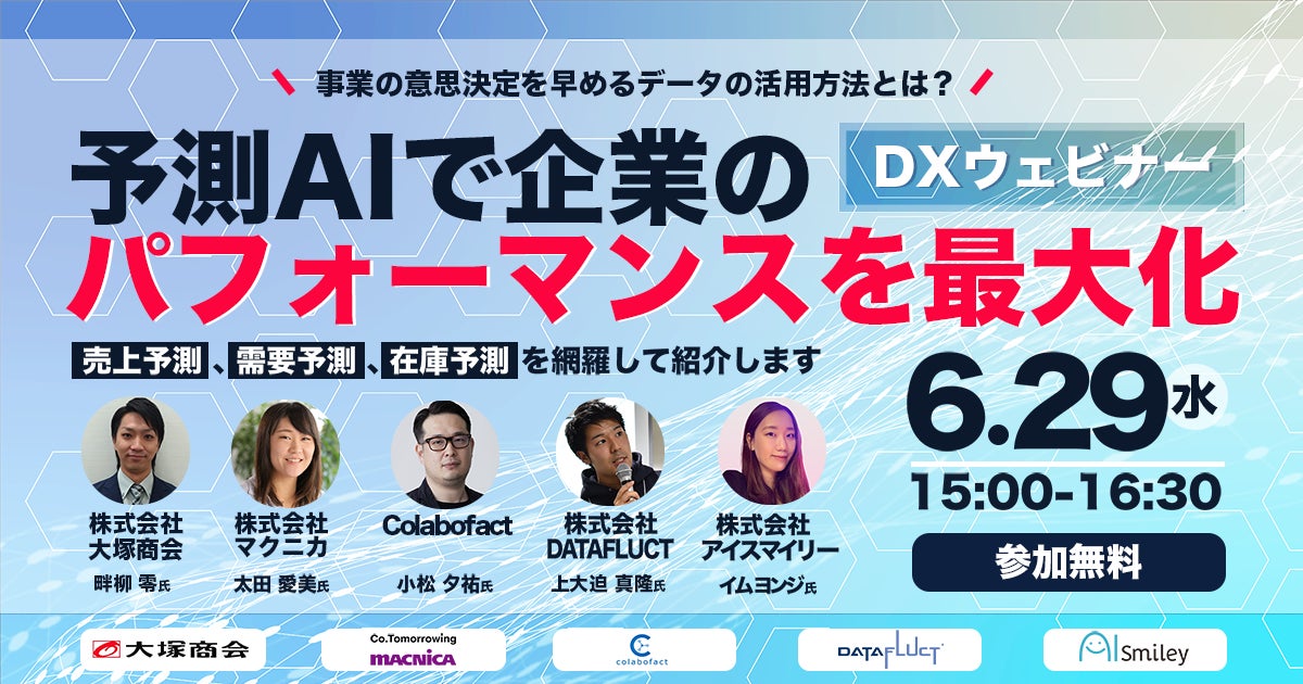 企業のDXを推進する国内最大級の AI ポータルメディア「AIsmiley」を運営するアイスマイリー(東京都渋谷区、代表取締役:板羽晃司)は、2022年6月29日(水)15時から「予測AIで企業のパフォーマンスを最大化」をテーマにDXウェビナーを開催します。