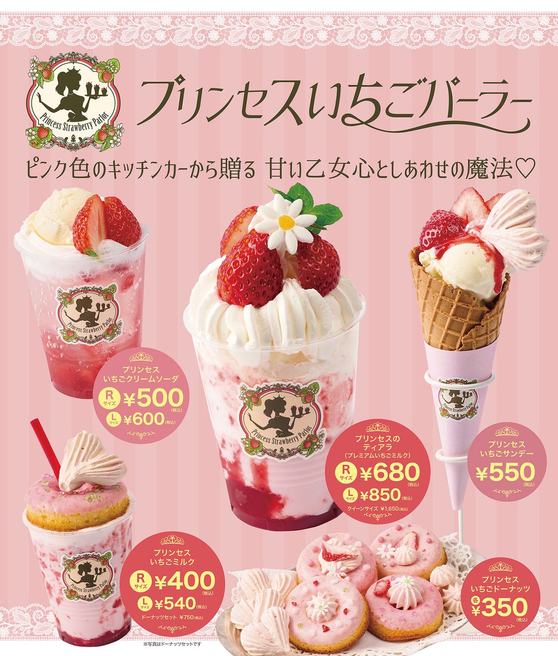 ■販売商品:プリンセスのティアラ(プレミアムいちごミルク)、プリンセスいちごクリームソーダ、プリンセスいちごサンデー、プリンセスいちごドーナッツ、プリンセスいちごミルク