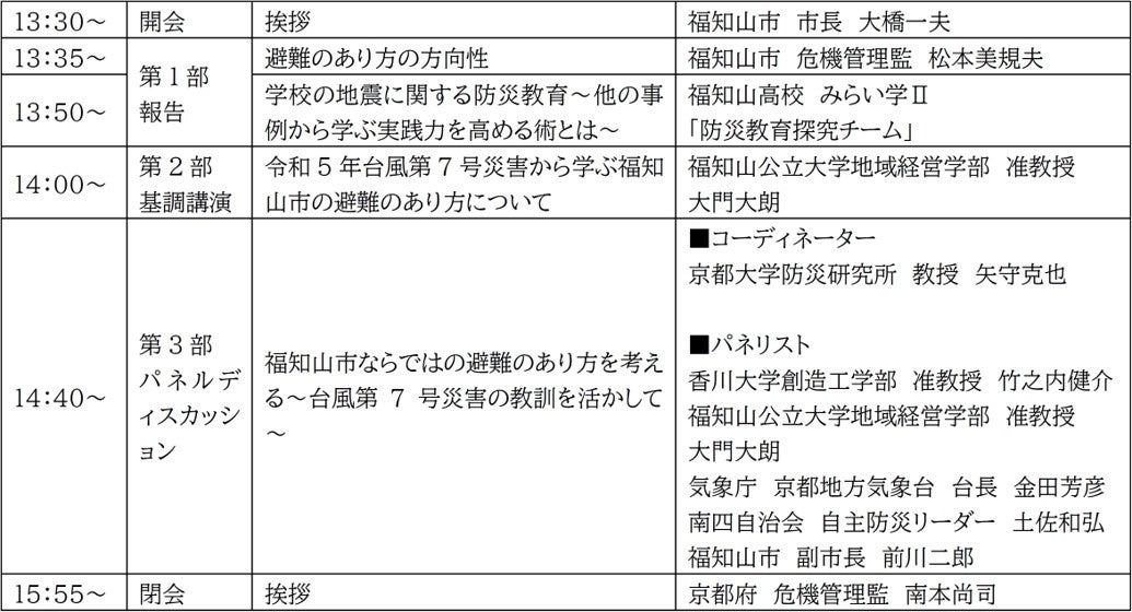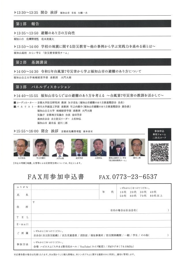 地元学生や教育機関、防災に関するスペシャリストが一堂に会し、昨年8月、福知山市に甚大な被害をもたらした令和5年台風第7号災害を振り返りながら、地域連携による“誰一人取り残さない防災”の実現をめざします。パネルディスカッションでは京都大学防災研究所の矢守教授をコーディネーターとして迎え、大学教員、防災関係機関、地元自主防災リーダーのパネリストそれぞれの視点で討論し、福知山市ならでは避難のあり方について全国の方々に情報発信します。