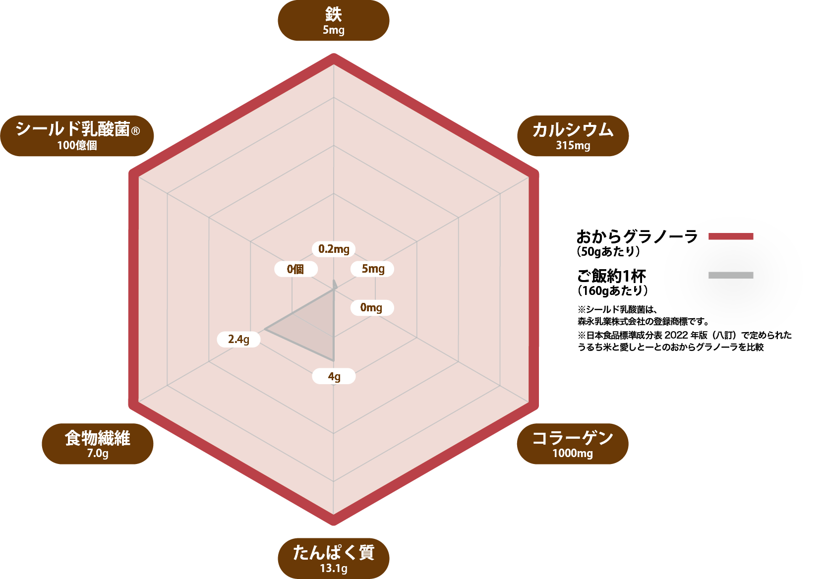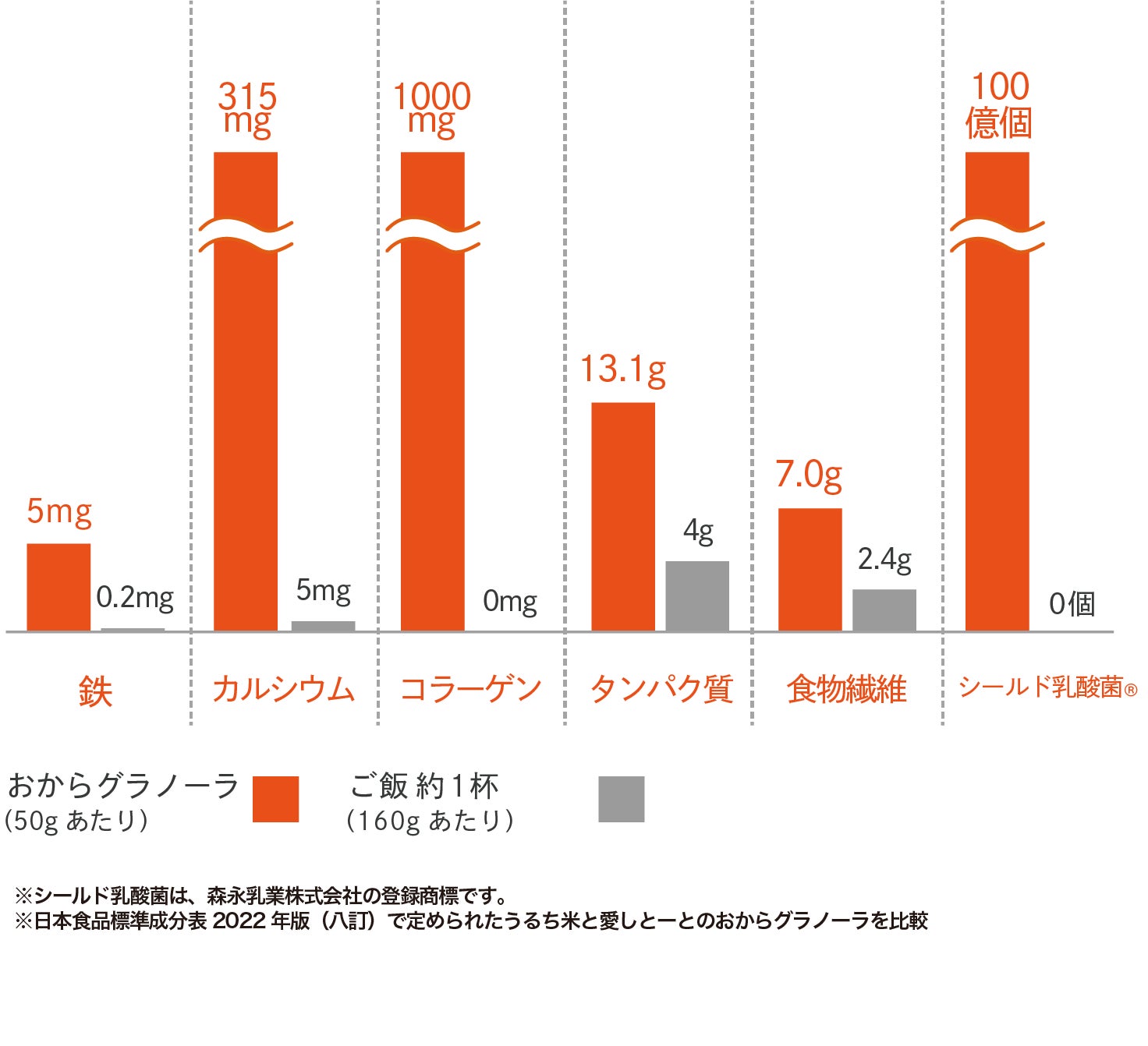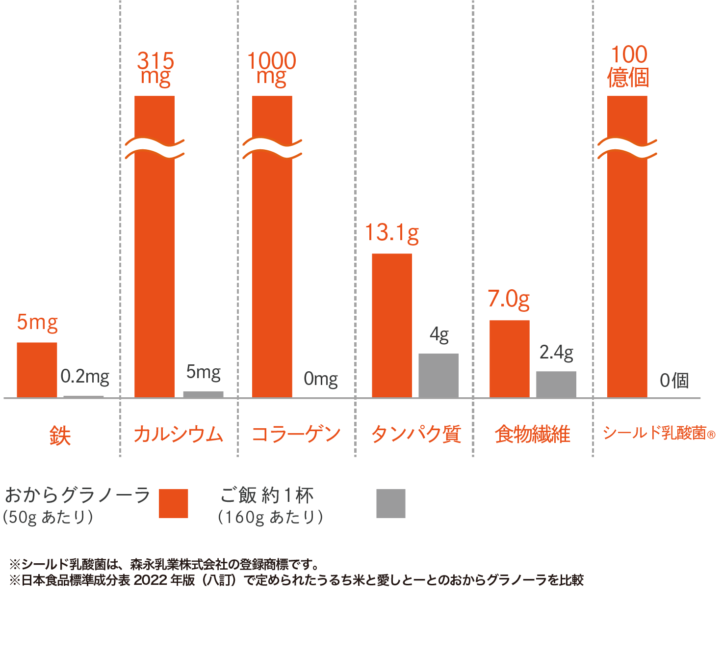 (※日本食品標準成分表2022年度(八訂)で定められたうるち米(ご飯160g)とおからグラノーラ(50g)を比較)