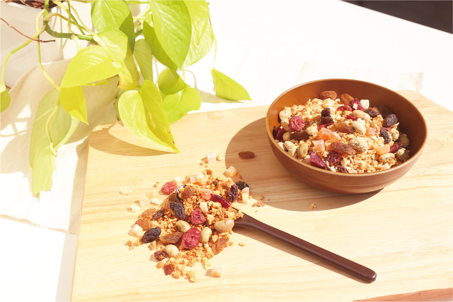 糖質はなんとご飯1杯分のわずか3分の1!(※)おからと高タンパクで低脂質の大豆ミートをフルーツやメープルシロップと合わせた美味しいグラノーラは朝食やおやつにもぴったり。
