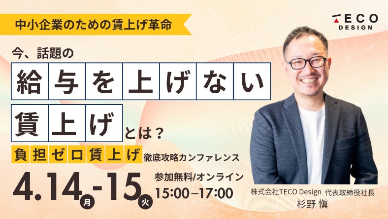 株式会社TECO Design(本社:東京都新宿区、代表取締役社長 : 杉野 愼、以下:当社)は、オンラインカンファレンス「今、話題の給与を上げない賃上げとは!?負担ゼロ賃上げ徹底攻略カンファレンス」に登壇いたします。