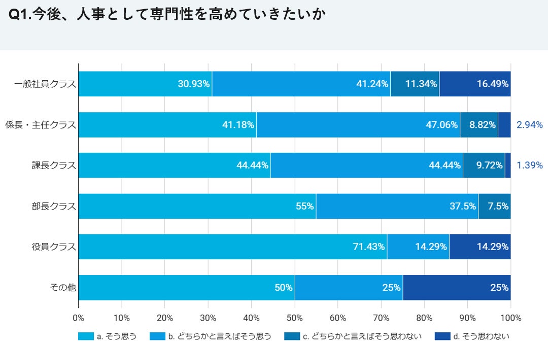 ・人事として専門性を高めていきたいかという問いに「そう思う」「どちらかと言えばそう思う」と回答したのは、一般社員クラスが約72%で、管理職になるとそれを上回るパーセンテージでした。