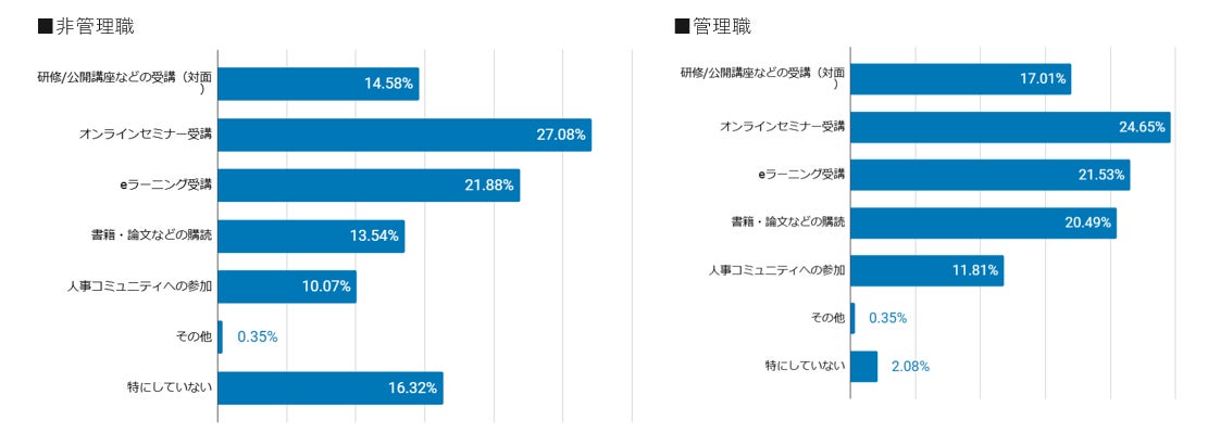 一方、管理職では「特に学習していない」と答えた人は約2%にとどまっています。学習層においては、多様なインプットの機会を活用しており、非管理職に比べて、書籍や論文などを活用する割合が高いのも特徴です。