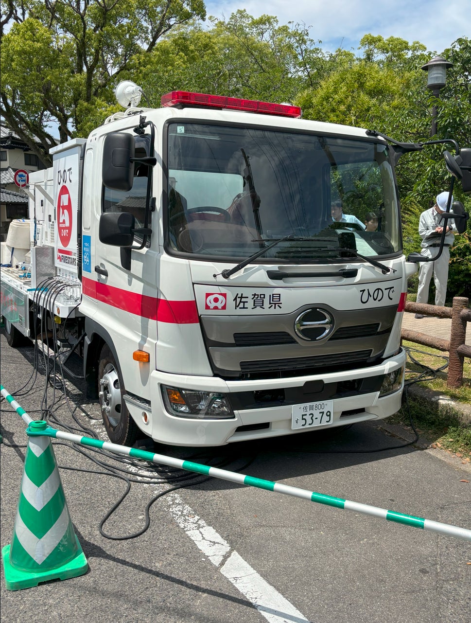 今回の実証試験では、流域治水の観点から、佐賀県所有の排水ポンプ車「ひので」の協力のもと、5万8,000トンという限界を超えて、お濠のさらなる水位低下が可能かを検証するものとなります。