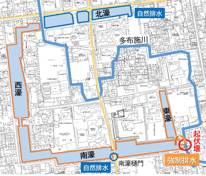 佐賀平野は、低平地で干満差が6mに達し、水はけが悪く、降った雨をスムーズに排出できない課題を抱えています。こうした佐賀市の地理的特性を踏まえ、全国有数の広大な水堀を有する佐賀城お濠を有効に活用する「流域治水」の取り組みとして、大雨時に調整池として活用しています。