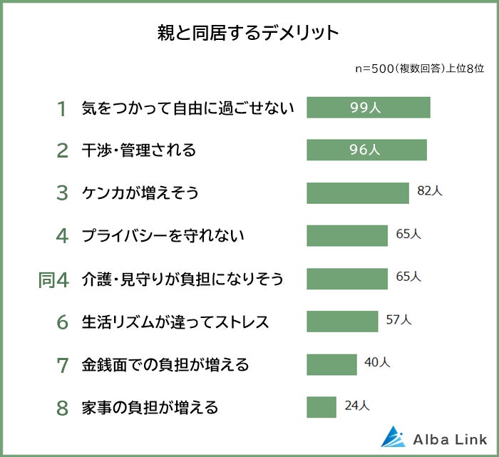 反対に「親と同居するデメリット」を聞いたところ、1位は「気をつかって自由に過ごせない(99人)」、僅差の2位は「干渉・管理される(96人)」でした。自由がなくなるのは、どの年代の親と同居する場合でも、多くの人が感じるデメリットでしょう。