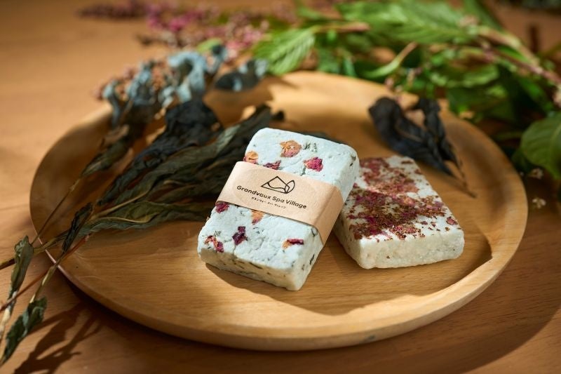 エリア内で栽培した藍の乾燥葉を使った「藍の石鹸づくり」を開催します。乾燥させた藍の葉を丁寧に煮出し、その染液を使って淡い青色の石鹸を作ります。藍は、古くから解毒や解熱、抗菌、抗炎症作用のある薬草として重宝されてきました。健やかな旅の思い出に、肌に優しく、風邪予防にも役立つ藍の石鹸を作り、お持ち帰りいただけます。