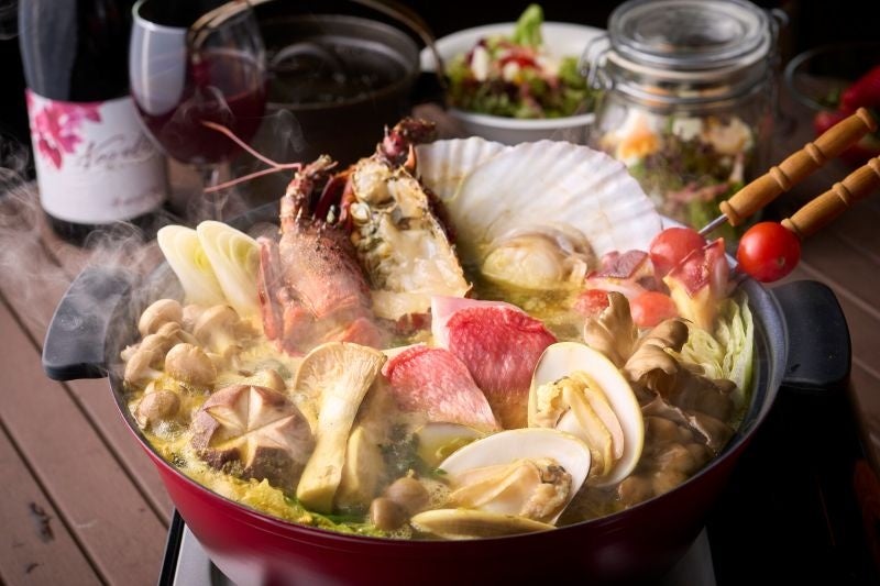 <房総 山の幸>の鍋プランでは、千葉県の豊かな自然が育んだブランド“房総ジビエ”を、130年以上の歴史を持つ千葉県佐倉市のコク深く芳醇なヤマニ味噌と、すっきりと上品な香りが広がる醤油の2種類のスープでご用意。素材本来の旨味が引き立つ、冬にうれしい奥深い味わいをご堪能いただけます。また、<房総 海の幸>の鍋プランでは、漁獲量全国トップクラスを誇る千葉県産の伊勢海老をはじめ、九十九里浜のハマグリや市場直送の鮮魚を贅沢に使用し、魚介の旨味が溶け込んだ濃厚なブイヤベースを味わっていただけます。〆には、旨味が凝縮したスープで仕上げるリゾットで、最後の一口まで至福の味わいをお楽しみいただけます。