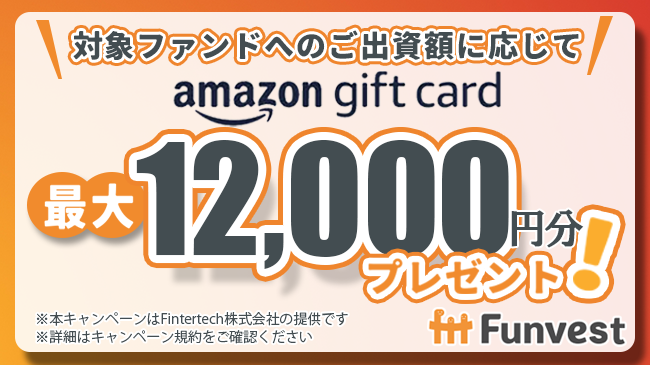 本ファンドへ出資していただいた投資家の皆様を対象として、出資額に応じて最大12,000円分のAmazonギフトカードをプレゼントするキャンペーンも併せて実施いたします。