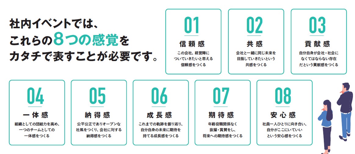 イベントはただ実施することを目的とするのではなく、「信頼感」「共感」「貢献感」「一体感」「納得感」「成長感」「期待感」「安心感」の8つの感覚を大切にすることで社員のエンゲージメントを高め、”行きたくなる魅力”を高める機会に昇華させることができます。