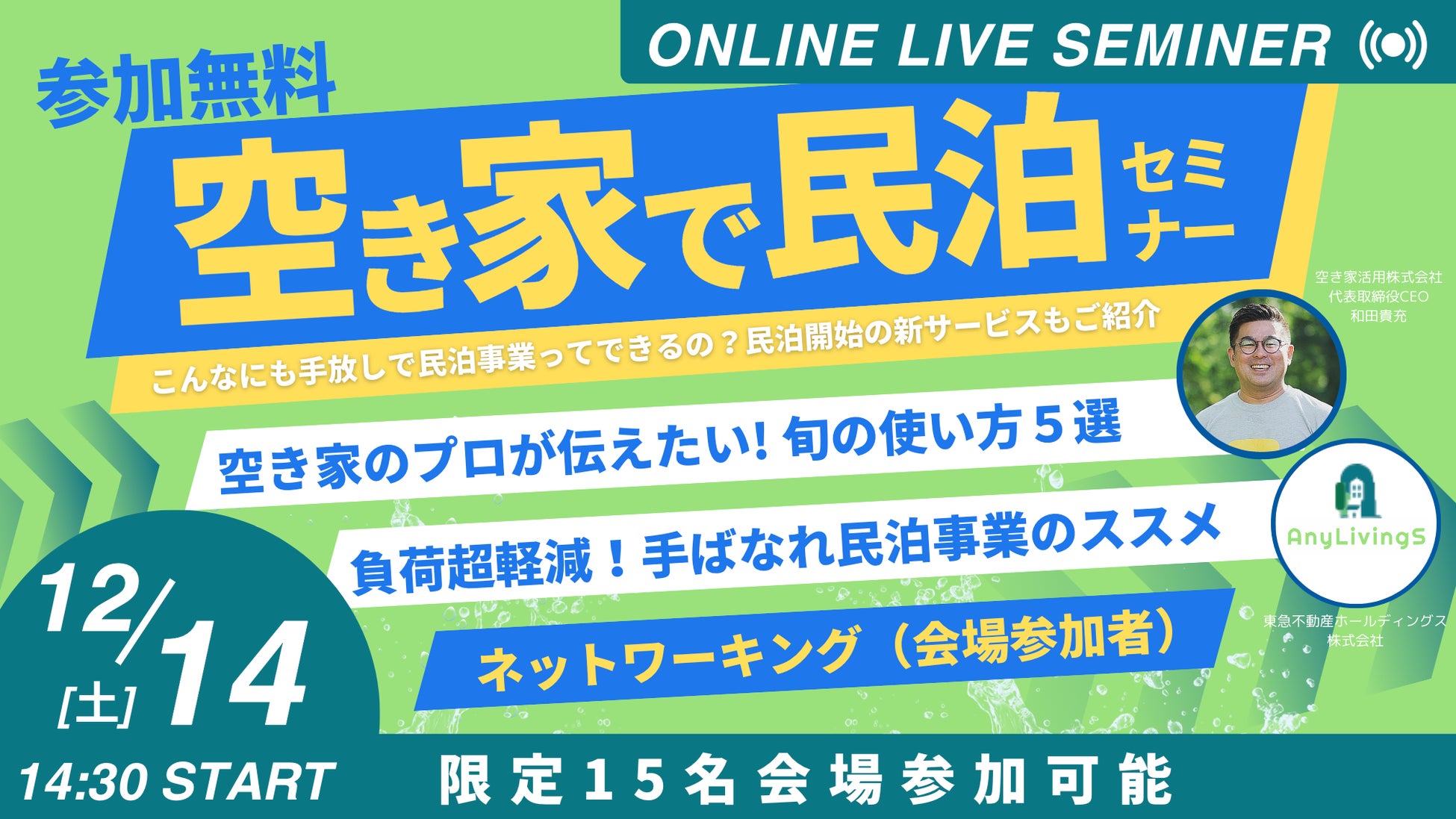 【12/13・14日の2日間開催】「空き家で民泊セミナー」 空き家活用のプロと、初期費用ゼロ!や手離れ抜群!な民泊の大注目ソリューションが登壇のセミナー。オンラインとオフライン開催で、参加無料!