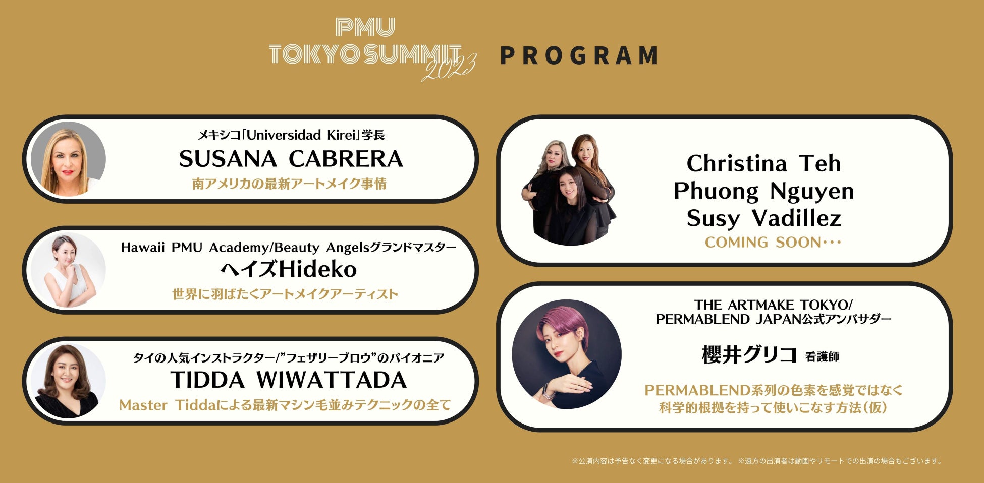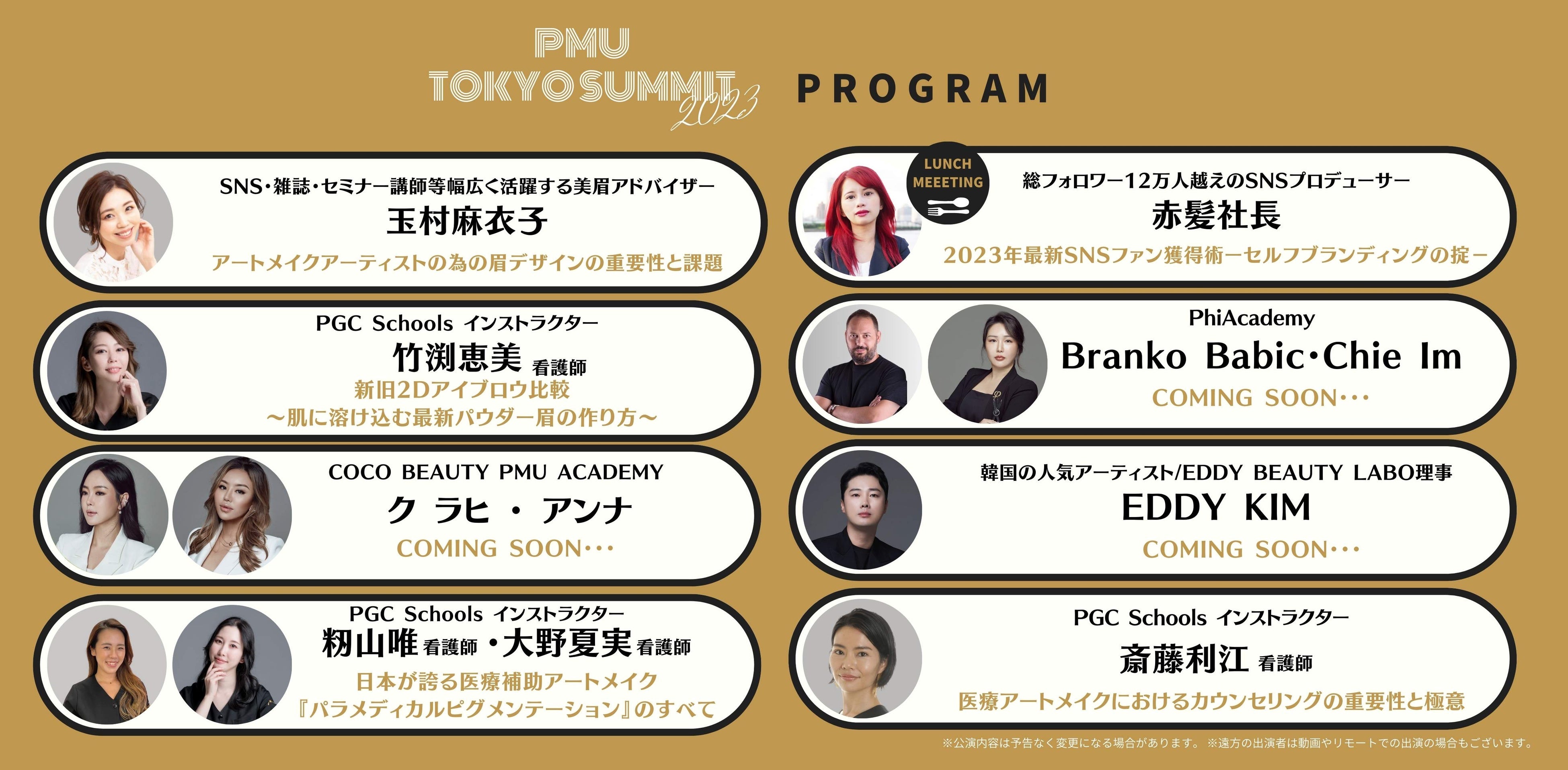 国内外の20名を超えるPMU人気アーティストが登壇し、現役アーティスト・インストラクター・アンバサダーとして活躍している登壇者達が、それぞれの経験から生み出された知識・技術を余すことなくお伝えします。