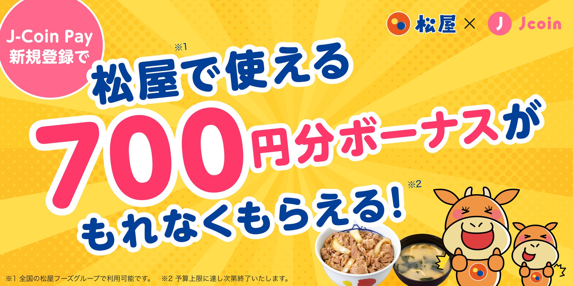 期間中に初めてJ-Coin Payに会員登録および金融機関口座登録をしていただいた方に、松屋グループでご利用いただける700円分のJ-Coinボーナスをプレゼントいたします。