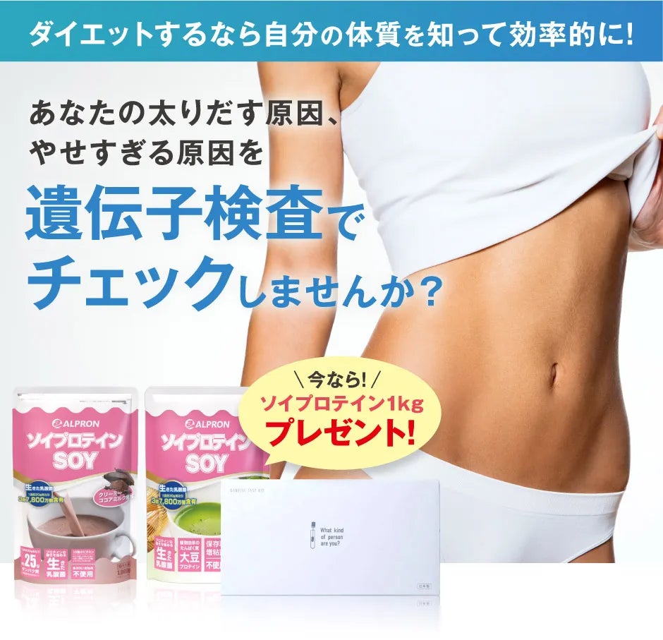 「この国の体力を強くする。」をミッションに掲げる プロテイン・スポーツ栄養食品メーカーの株式会社アルプロン(本店:島根県雲南市、 代表取締役 坂本雅俊)は、数量限定でダイエット遺伝子検査キットを定価より31%offの5,980円で販売開始しました。さらにいまならソイプロテイン1kgを無料プレゼント!