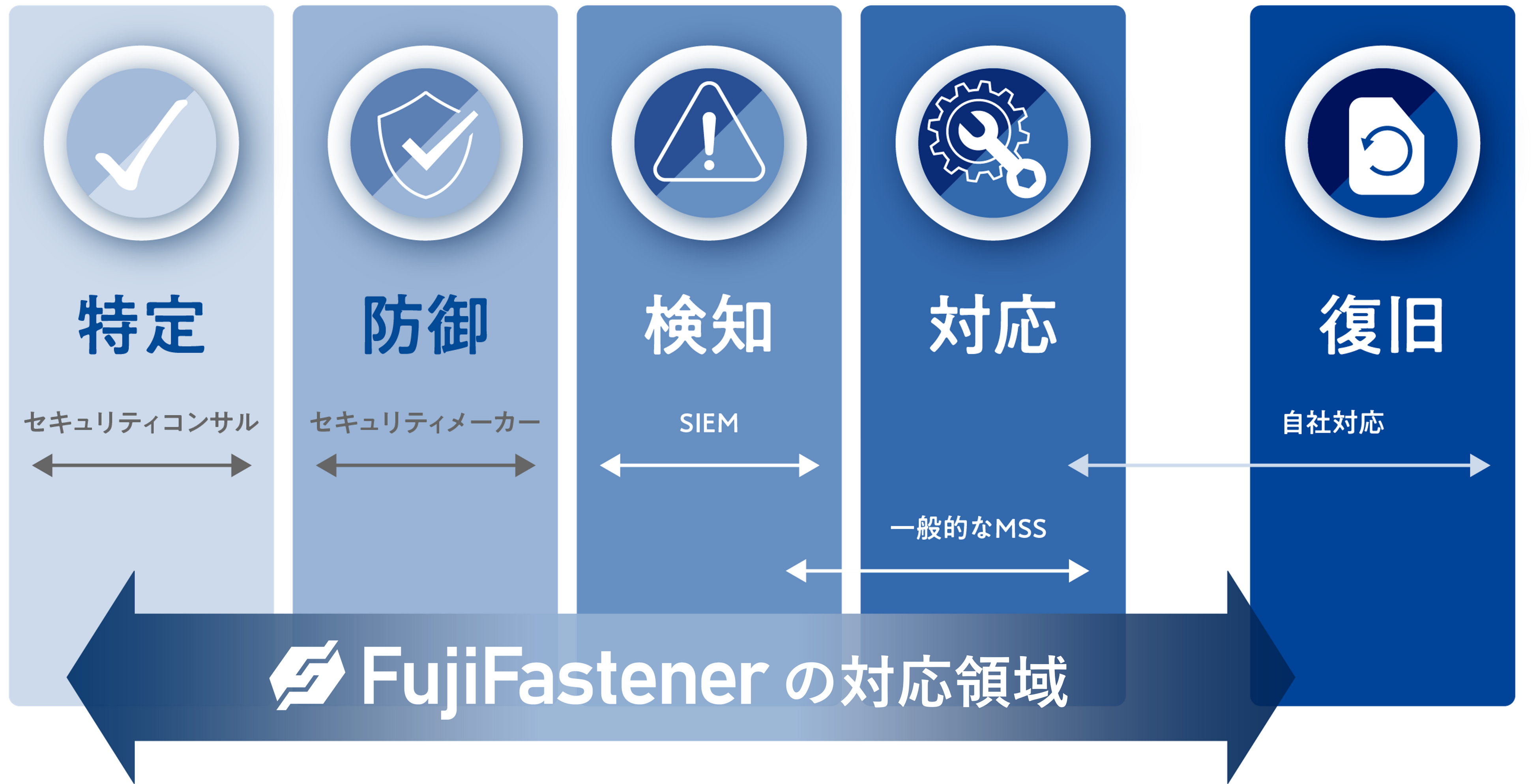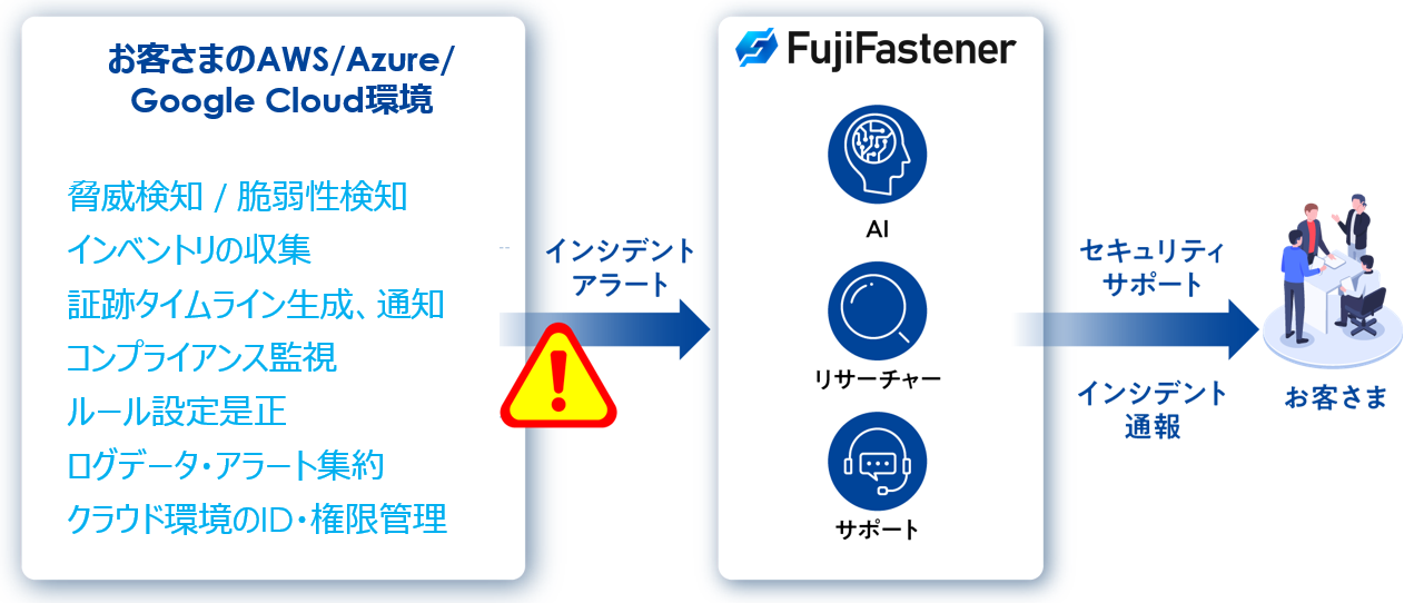 FujiFastenerは、セキュリティエンジニアとAIにより、各種セキュリティサービスに対するログやアラートを集約、お客様環境にあわせたトリアージを実施し、脅威レベルに応じたアラーティングを実施いたします。また、お客様の組織体制、課題・状況に合わせて柔軟に導入できるため、お客様のクラウド環境の万全なセキュリティを実現し、業務負荷を大幅に削減できます。