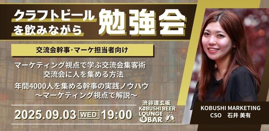 渋谷のマーケター&起業家コミュニティを運営するKOBUSHI MARKETING合同会社(東京都渋谷区、代表:井上裕介)は、2025年9月3日(水)19:00~マーケティング視点で交流会集客術を学べる勉強会を開催すると発表した。