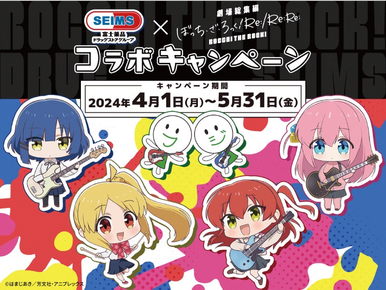 医薬品の研究開発から製造・販売までを行う複合型医薬品企業の株式会社富士薬品(本社:埼玉県さいたま市 代表取締役社長:高柳 昌幸、以下「富士薬品」)は、2024年4月1日(月)から5月31日(金)までの期間、富士薬品グループが運営するドラッグストア(※1)において、セイムス×「劇場版総集編ぼっち・ざ・ろっく!Re:/Re:Re:」コラボキャンペーンを開始します。