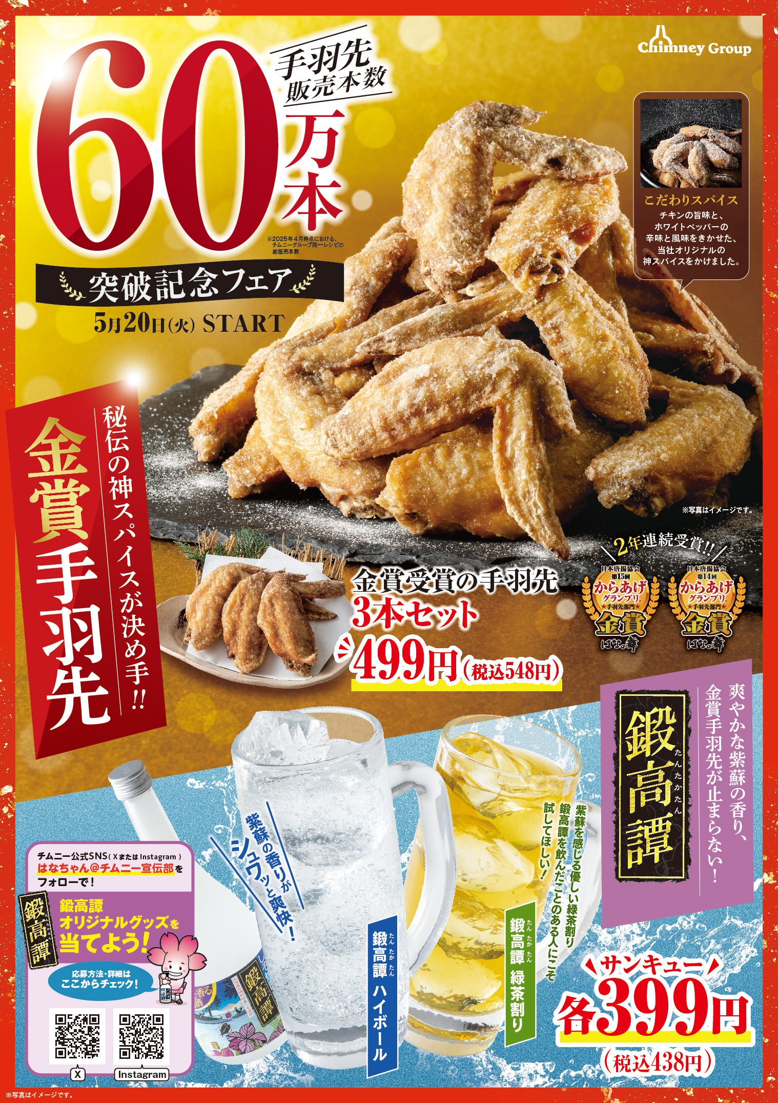 【チムニー株式会社】からあげグランプリ金賞受賞 「手羽先唐揚げ 販売累計60万本突破記念フェア」開催。