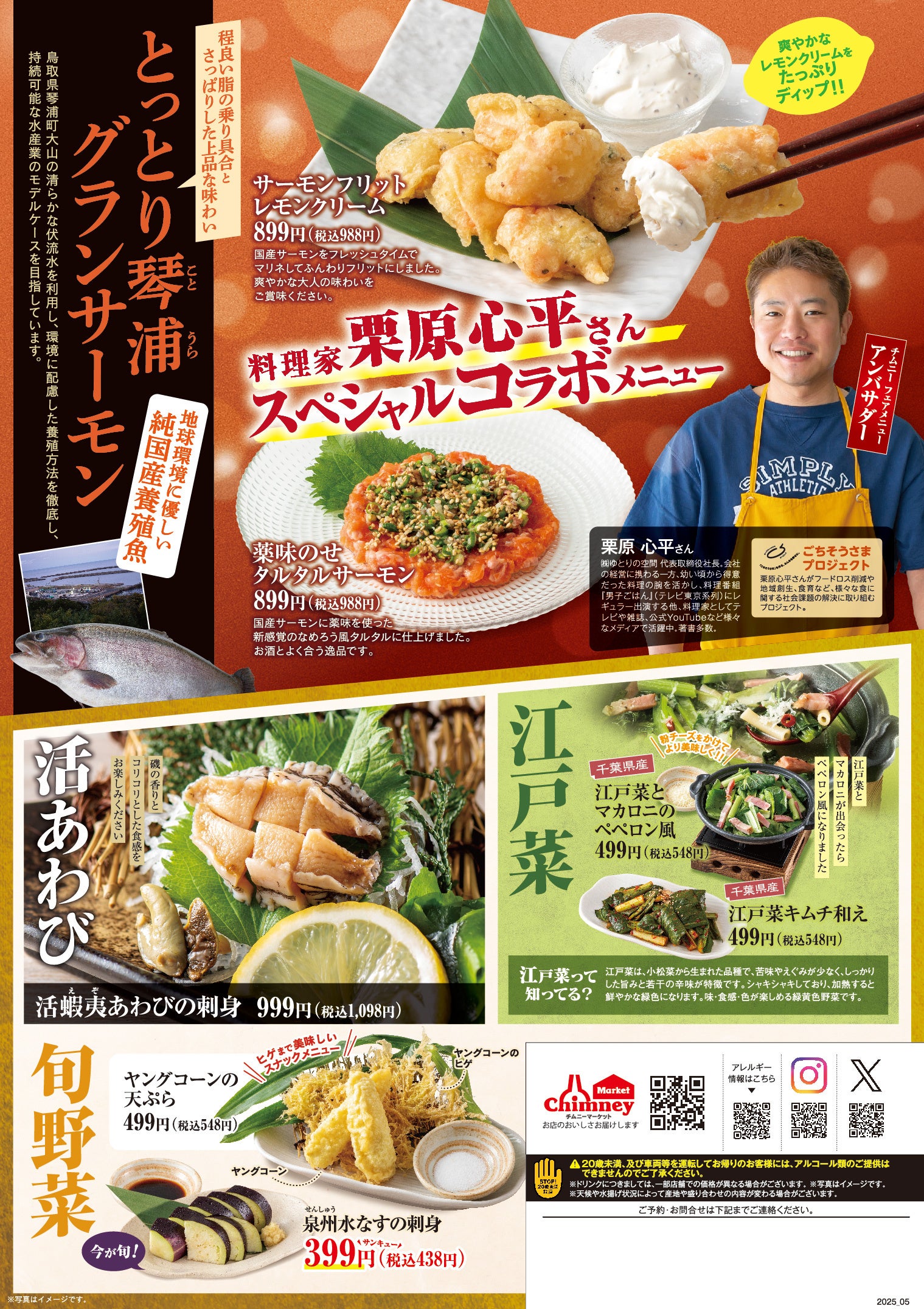 その他、料理家 栗原心平氏コラボ第5弾の純国産養殖魚「とっとり琴浦グランサーモン」を使用したオリジナルメニューや、希少「活蝦夷あわび」等ごちそうメニューなど、全10品の期間限定メニューをご用意いたします。