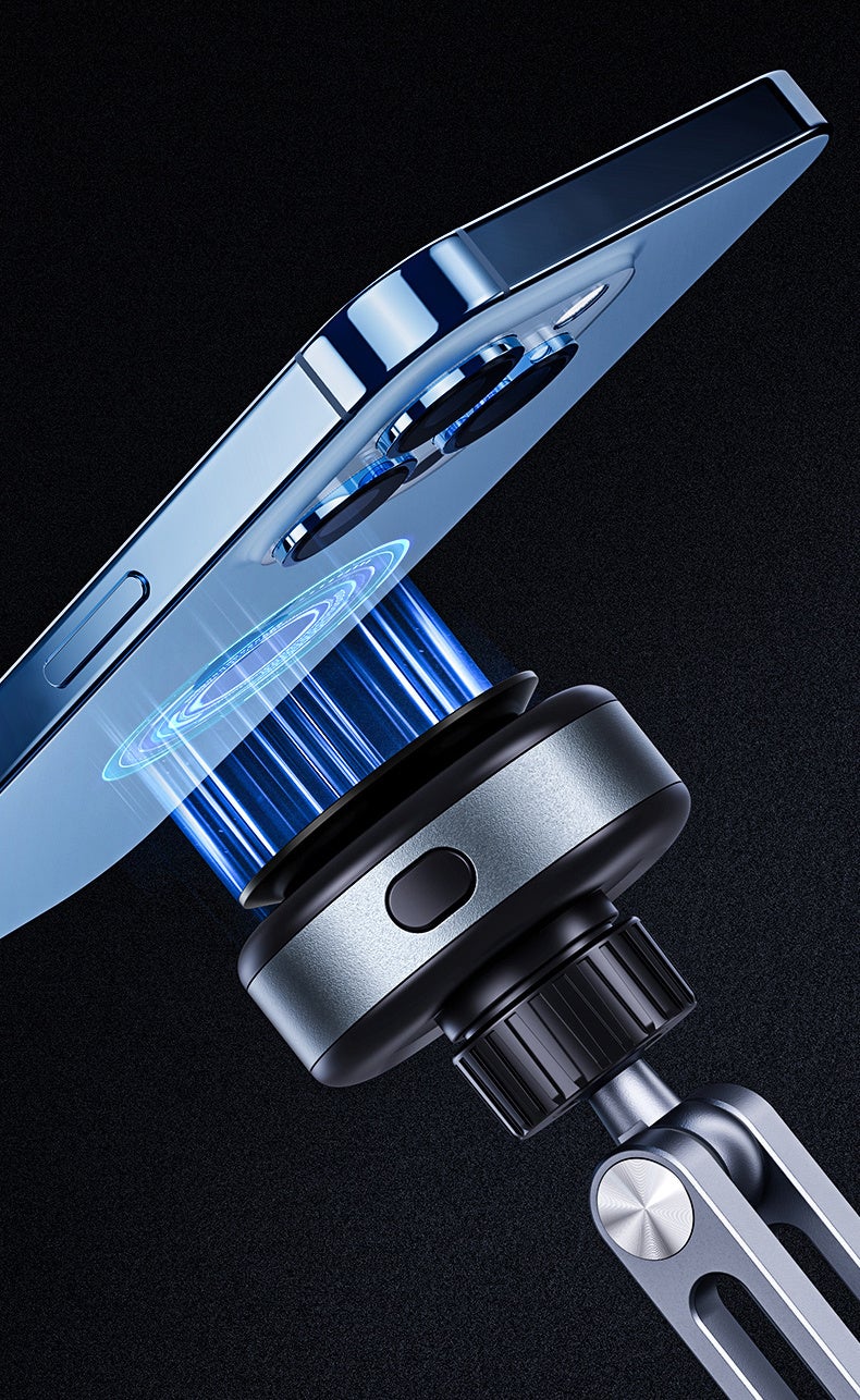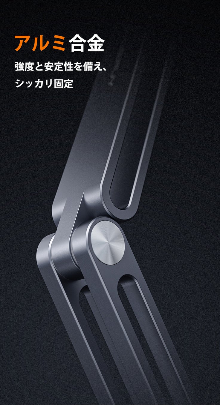 スタンドのヘッドにある凸部分にタブレットPCやスマホを押し当てるだけで自動検知し、瞬時に強力な吸着を開始します。高耐久の吸盤を採用しており、一度固定すれば簡単には外れません。