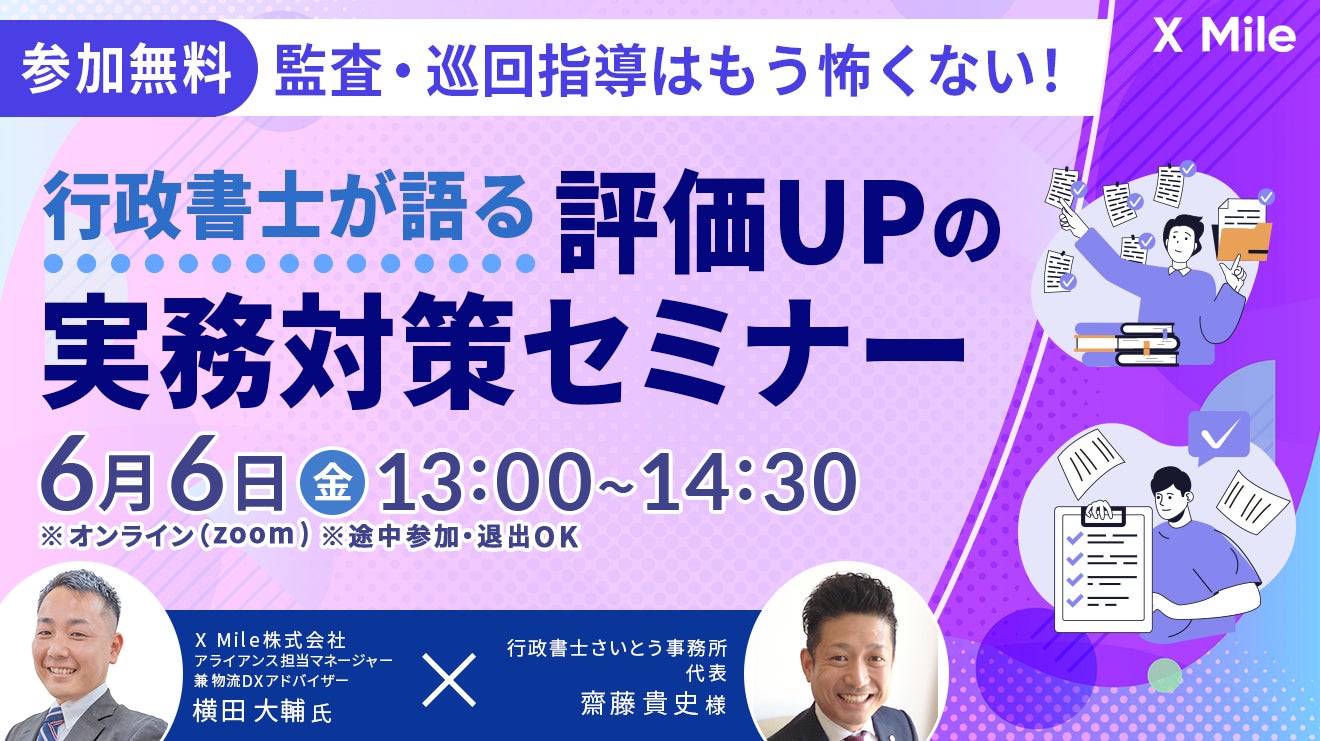 物流事業者向けSaaS・プラットフォーム「ロジポケ」を提供するX Mile株式会社(読み:クロスマイル、本社:東京都新宿区、代表取締役:野呂 寛之、以下「当社」)は、行政書士さいとう事務所(本社:栃木県宇都宮市、代表:齋藤 貴史、以下「行政書士さいとう事務所」)と共同で、物流業界向けのセミナー「監査・巡回指導はもう怖くない!行政書士が語る評価UPの実務対策セミナー」を開催いたします。
