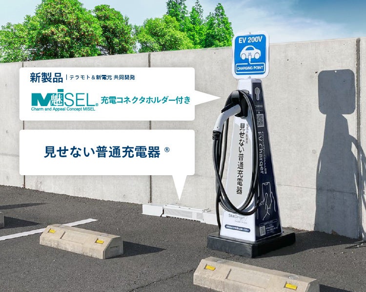 テラモト製「MISELメッセージポール-EV充電コネクタホルダー付き」は、オリジナルデザインが可能なおしゃれなメッセージポールの新展開製品です。テラモトは、これまで灰皿付き、消毒容器台付き、パネル型など豊富なメッセージポールを販売して参りましたが、この度、新電元製「見せない普通充電器」をより便利で柔軟に運用できるアイテムとして、ポール型EV充電コネクタホルダーをラインナップ追加しました。当社製「見せない普通充電器」は、壁面のほか床面や天井にも固定できるコンパクトな6kW出力のEV用普通充電器です。装置本体の設置施工時に固定柱などの自立構造物を新たに建設する必要がなく、あえて目立たず隠すような場所にも設置できる特長があります。その分、充電コネクタをより自由な位置に設置することができますので、簡易設置からクリエイティブな演出まで妥協なく対応することができます。 「見せない普通充電器」と「MISELメッセージポール-EV充電コネクタホルダー付き」の組み合わせにより、充電コネクタ柱の設置場所検討やコンクリート基礎施工などの煩わしい課題が解消され、さらには優れたデザイン性と便利さを手軽に提供できるようになりました。 当社とテラモトは、EV充電器を導入する皆さまの自由で柔軟な発想を支援することで、人々の暮らしと地球環境に優しい次世代モビリティ社会の実現に貢献して参ります。