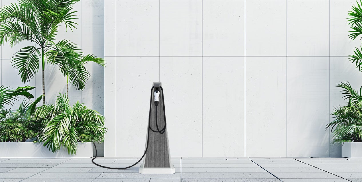 新発想「置くだけ」のEV充電コネクタポール。ベストな位置に動かせるから毎日の充電作業が0歩で完了。好きなデザインを印刷すれば空間演出やサービス案内看板にも使える。穴あけ施工も基礎施工も一切不要。