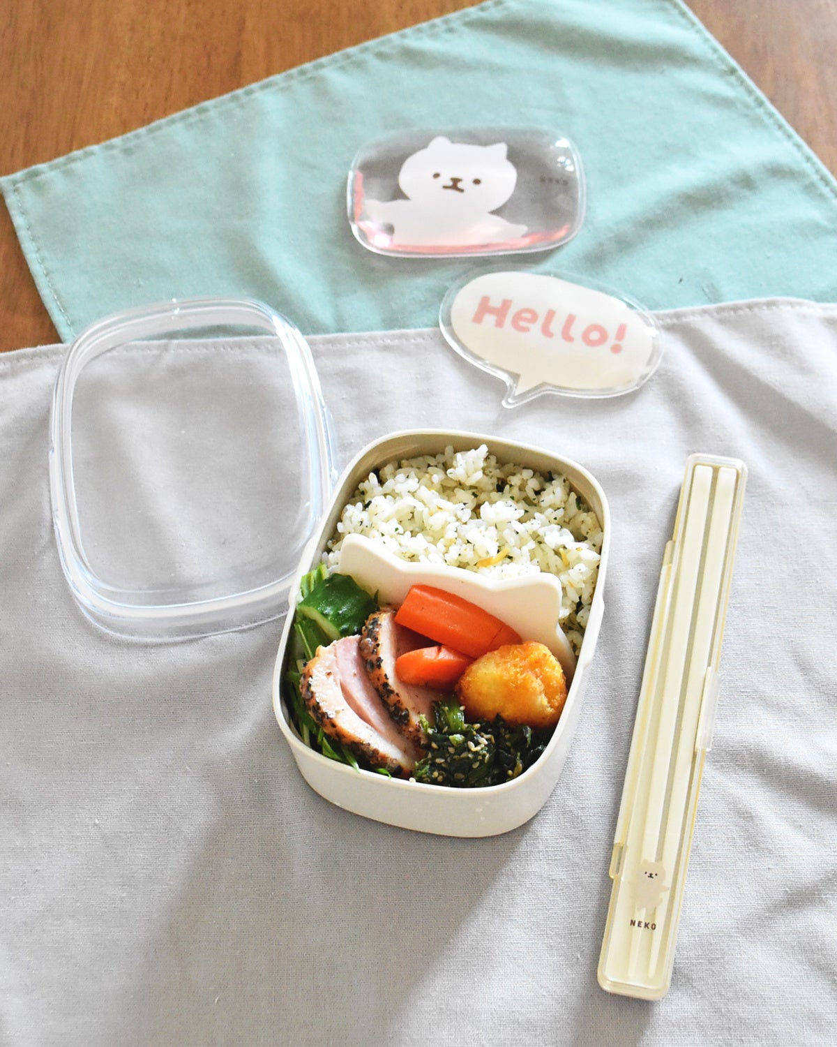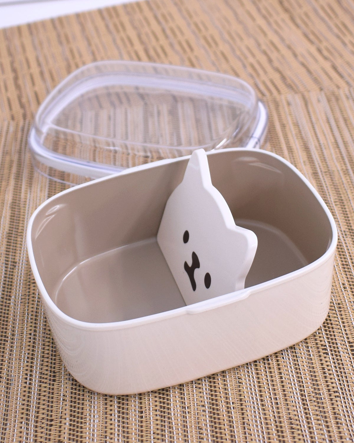 お弁当をつめると耳がちょこんと見え隠れ。ランチタイムにお弁当を食べ進めるとキャラクターの顔がだんだん見えてきます。