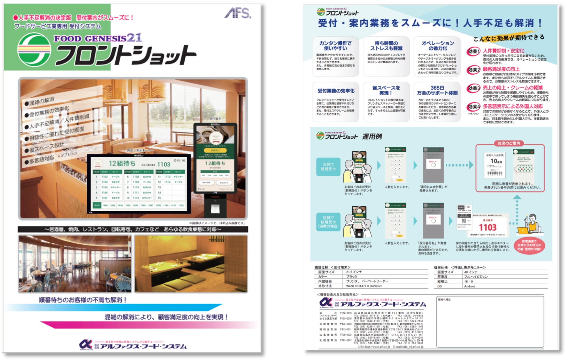 この受付管理システム「フロントショット」は、受付端末でお客様自身が受付登録を⾏っていただいた後、席のご案内票を印刷いたします。満席の場合は、順番登録され、お客様の順番になると呼出表示端末でアナウンスし、受付登録を⾏っていただく流れになります。受付・順番管理までが自動化できるため、スムーズな受付・案内業務ができ、従業員の業務負担を軽減し、お客様の待ち時間を短縮することができる受付システムです。また、「フロントショット」は、テーブルショット(テーブルオーダー端末)と POSとも連携しており、会計時に受付時に発⾏される案内票をスキャンと同時に会計完了=空席対象テーブルとして情報連携されます。