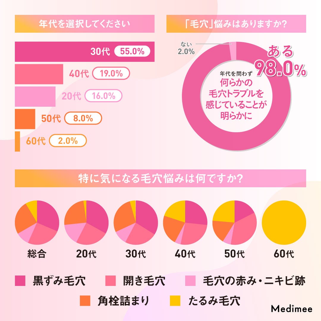 今回の調査では、ほとんどの人が毛穴に関する悩みを抱えていることが明らかになりました。中でも「黒ずみ毛穴」や「開き毛穴」「角栓詰まり」への悩みが多く、年代が上がるにつれて「たるみ毛穴」や「乾燥による目立ち」に関心が移っていく傾向が見られました。