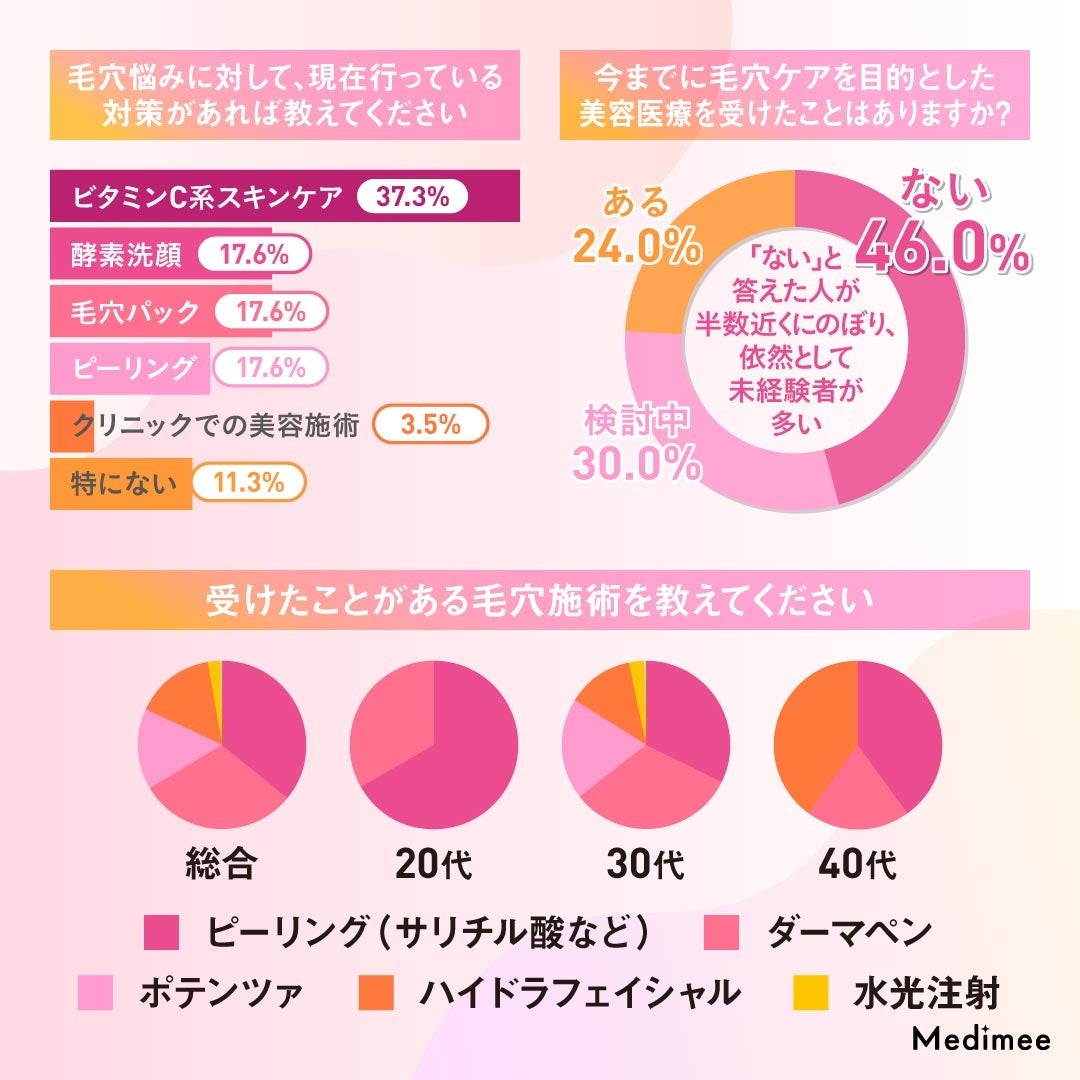 一方で、「検討中」と答えた人も3割程度、すでに「受けたことがある」と答えた人も約25%に達しており、毛穴悩みへの対策として美容医療が徐々に浸透してきている様子がうかがえます。