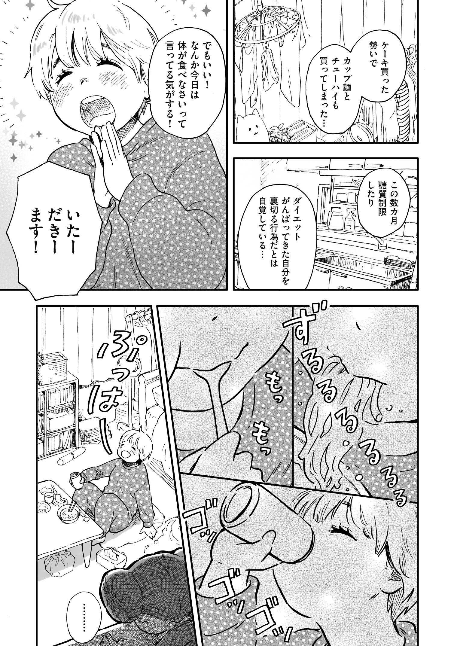 そんなとある日、心も体も耐えきれなくなり、ダイエットのためにずっとガマンしてきた夜中のケーキやカップ麺を解禁! 缶チューハイも買って暴飲暴食にふける夜。