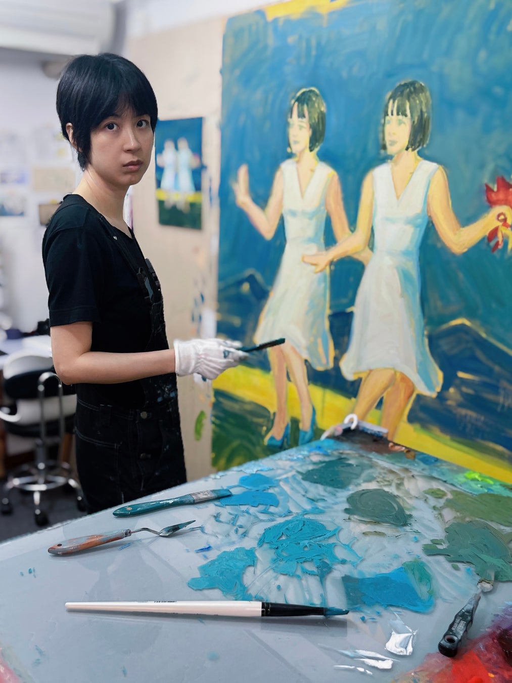 近年は、油彩やドローイングに加え、木彫と陶芸を組み合わせた彫刻作品も発表しています。
