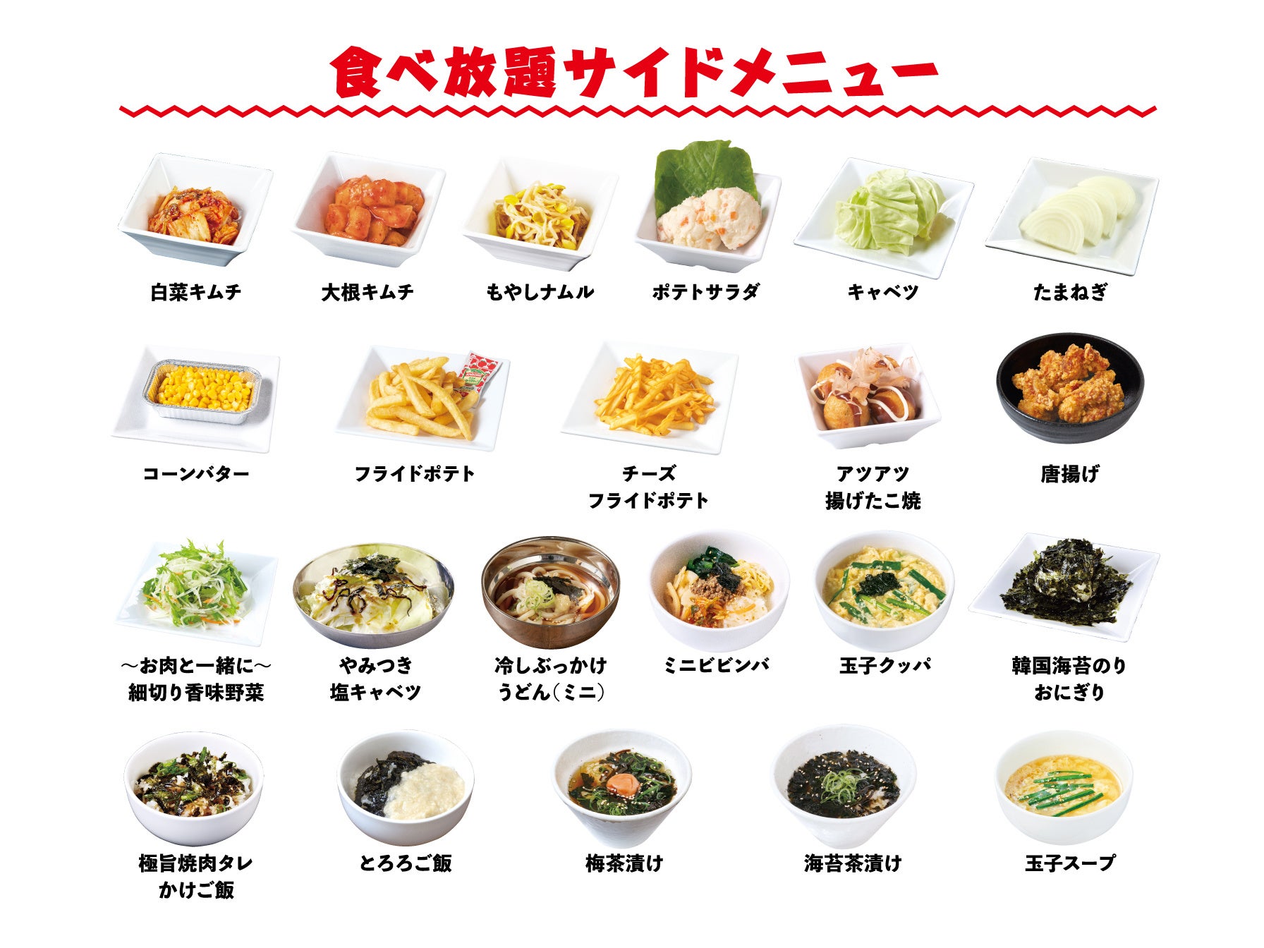 白菜キムチ、大根キムチ、もやしナムル、ポテトサラダ、キャベツ、たまねぎ、コーンバター、フライドポテト、チーズフライドポテト、アツアツ揚げたこ焼、唐揚げ、細切り香味野菜、やみつき塩キャベツ、冷しぶっかけうどん(ミニ)、ミニビビンバ、玉子クッパ、韓国海苔のりおにぎり、極旨焼肉タレかけご飯、とろろご飯、梅茶漬け、海苔茶漬け、玉子スープ