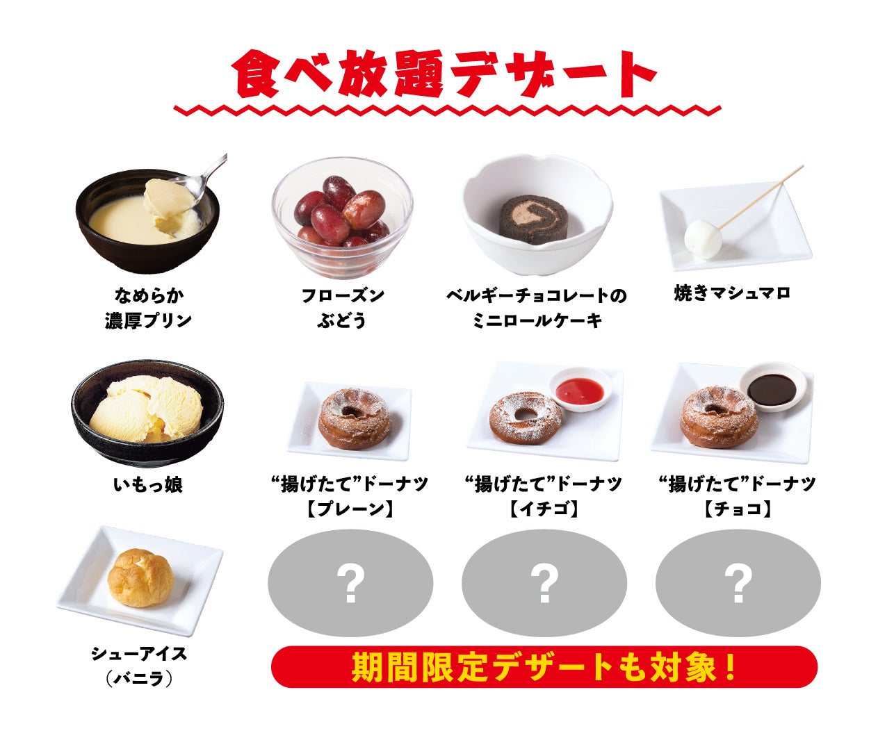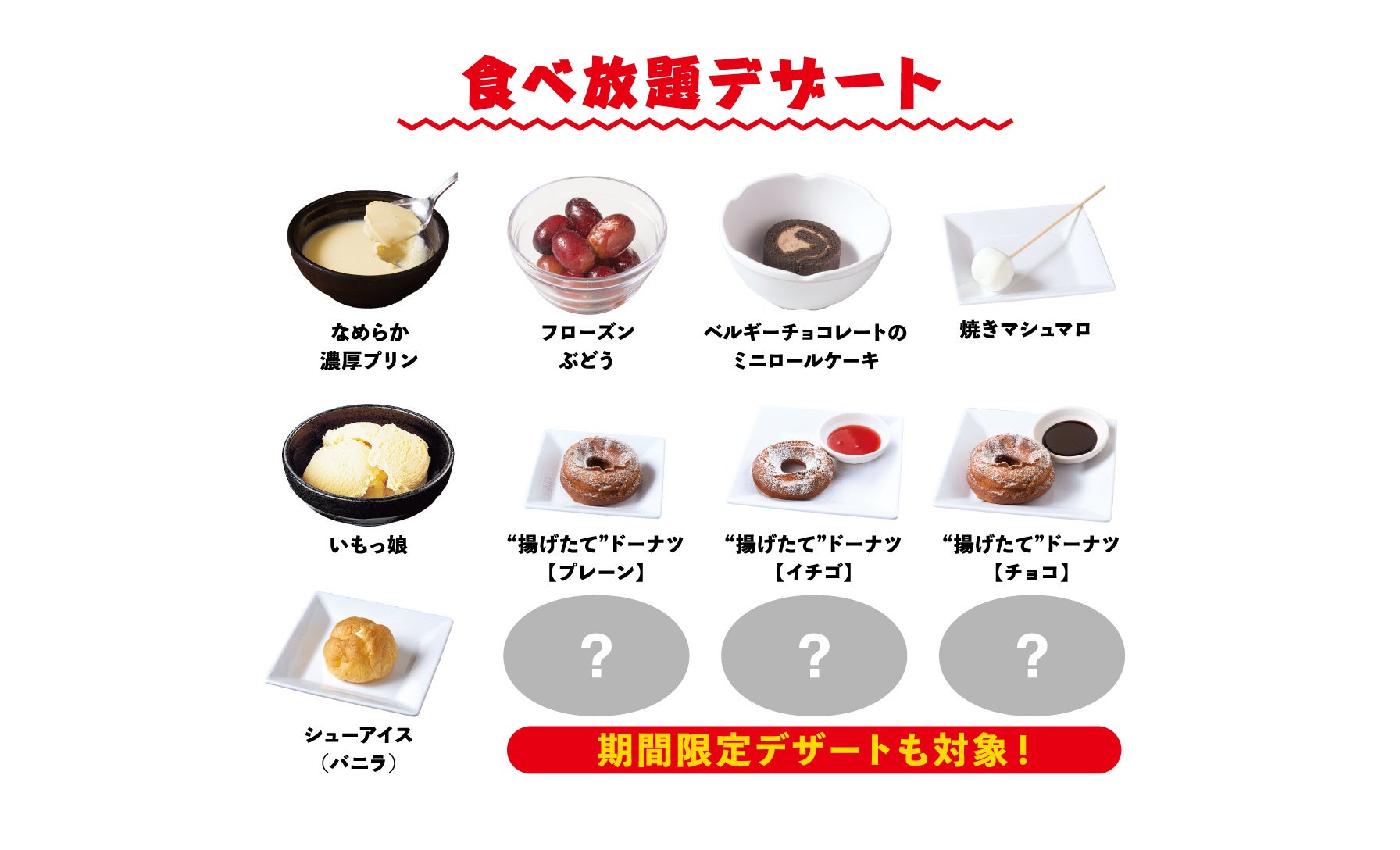 なめらか濃厚プリン、フローズンぶどう、ベルギーチョコレートのミニロールケーキ、焼きマシュマロ、いもっ娘、“揚げたて”ドーナツ【プレーン/イチゴ/チョコ】、シューアイス(バニラ)、期間限定デザート(時期によって異なります)